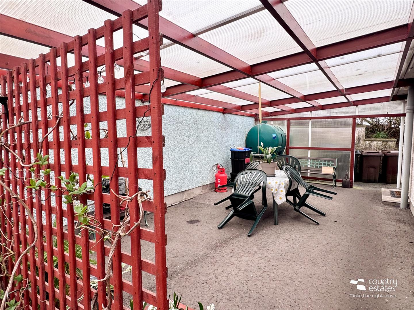 Driveway with ample parking for a variety of vehicles leading to full width covered secure carport to rear. Outside tap and light.