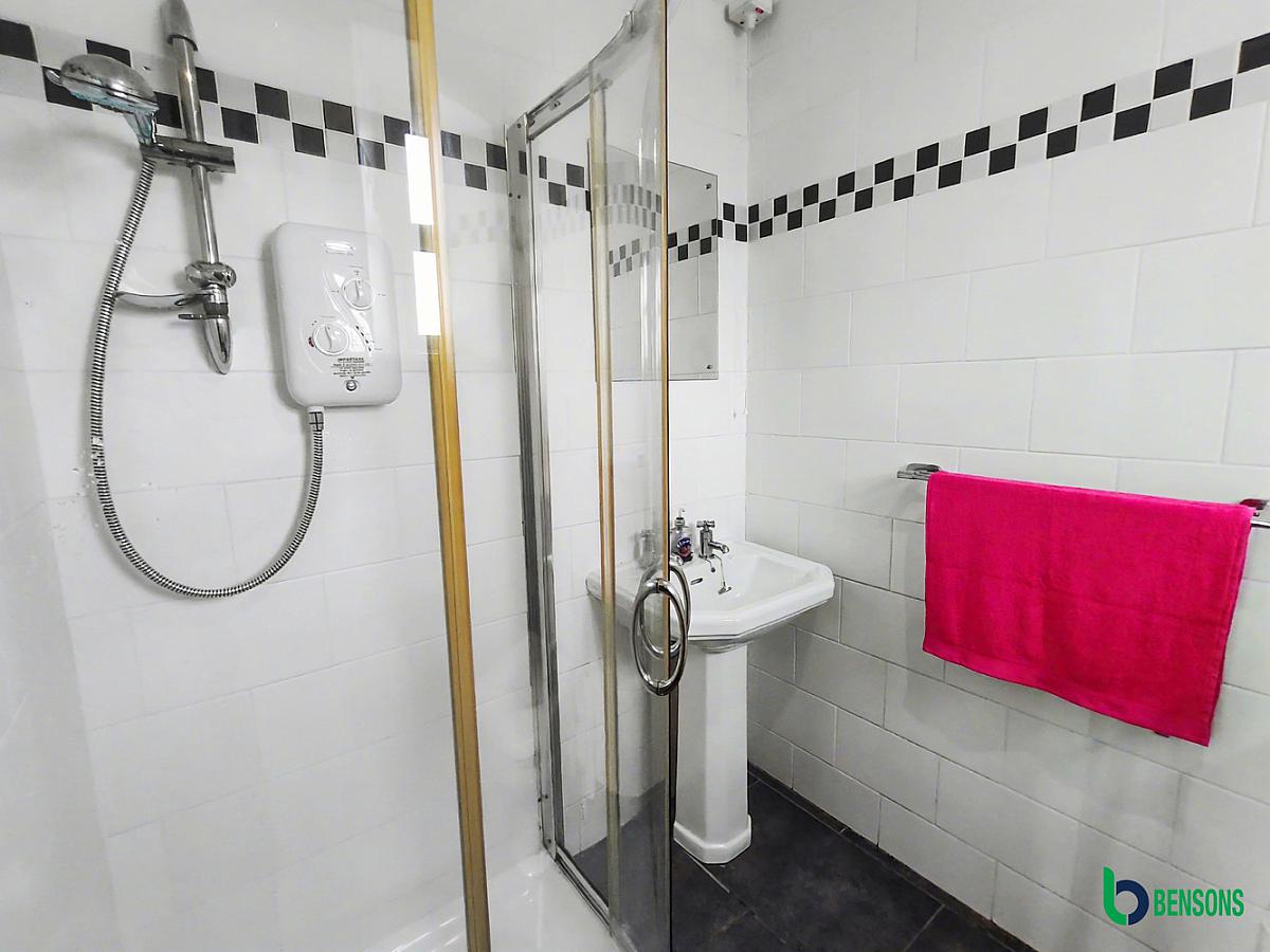 With fully tiled walk in shower cubicle, wc, wash hand basin, recessed lights, tiled walls and floor.