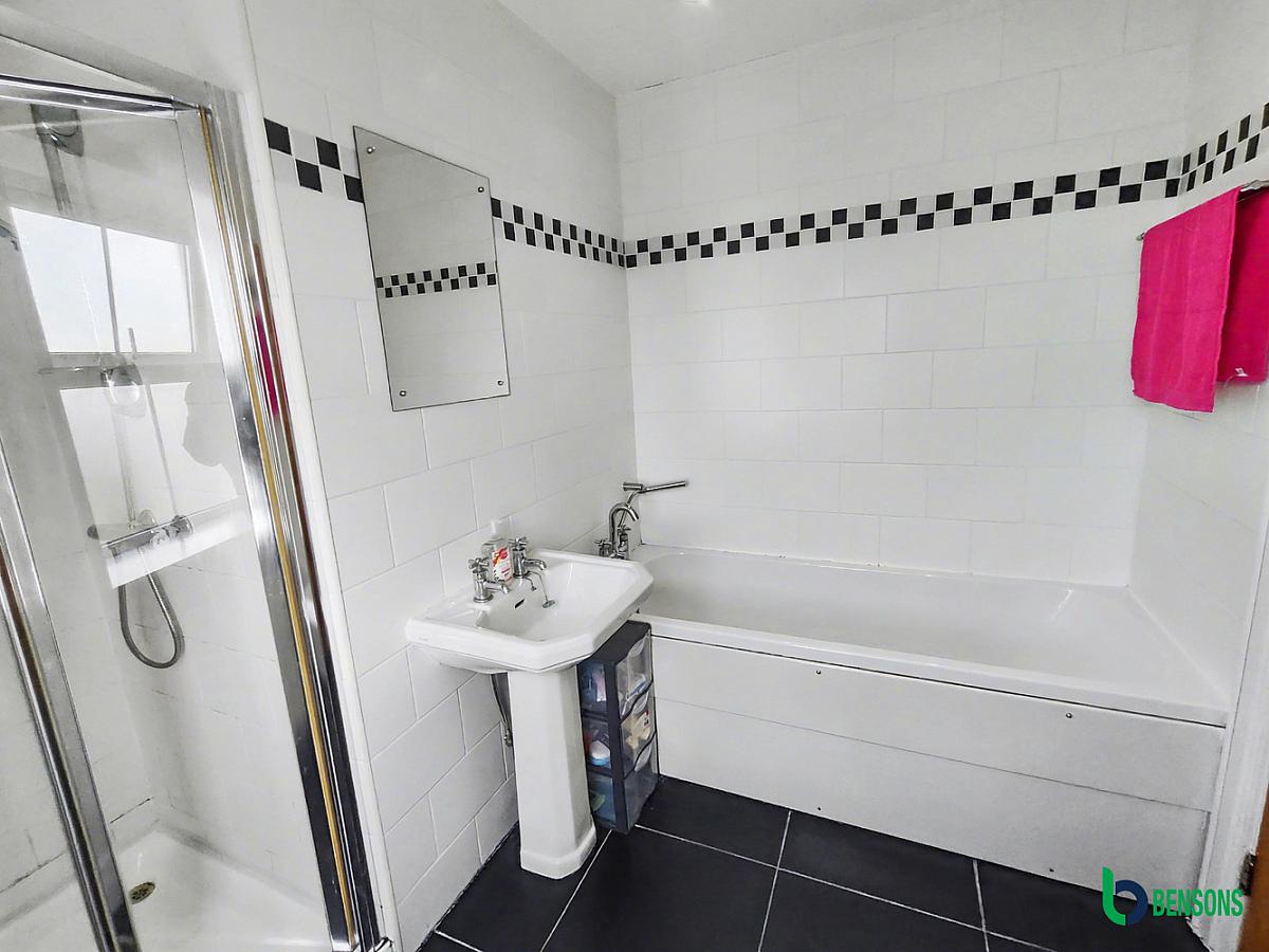Suite comprising fully tiled walk in shower cubicle, bath with hand shower attachment, wc, wash hand basin, recessed lights, extractor fan and tiled floor.