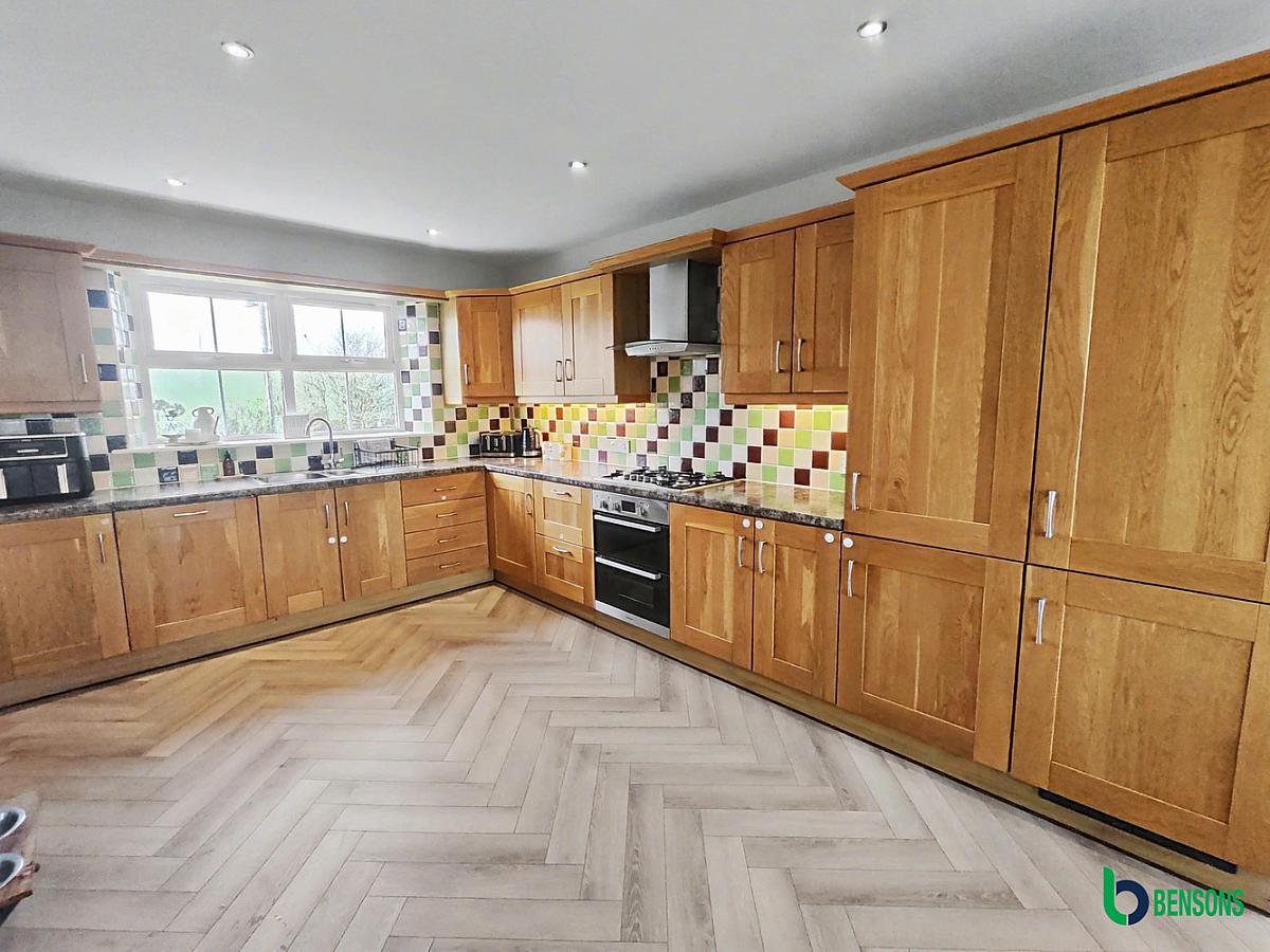 With fully fitted extensive range of eye and low level units with tiling between and under lighting, one and a half bowl stainless steel sink unit, integrated hob and oven with extractor fan, integrated fridge/freezer, integrated dishwasher, low level corner unit with pull out mechanism, recessed lights, laminate flooring and open plan to sun room. Measurements to widest points.