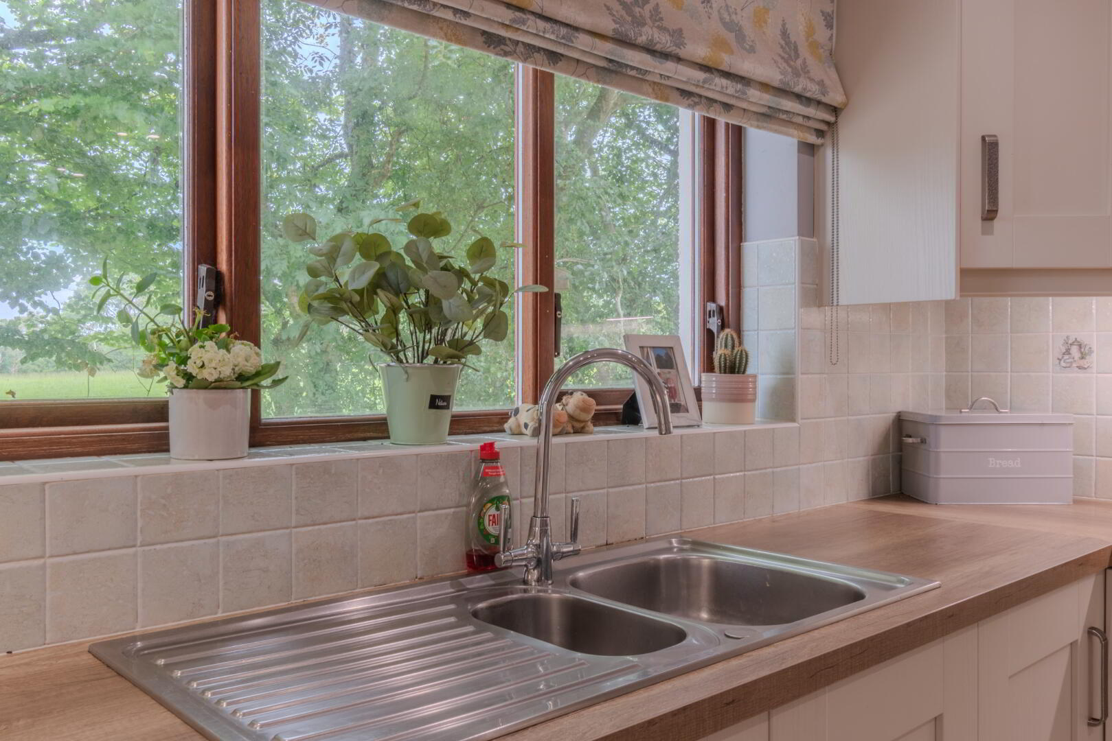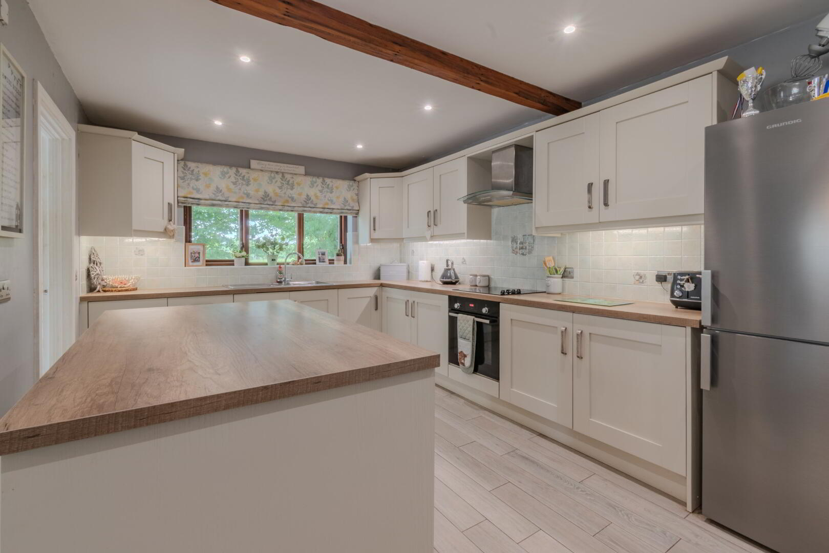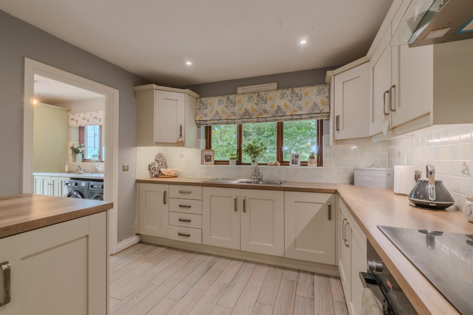 Wood Effect Tile Flooring, Eye & Low-Level Wooden Units with Laminate Worktop, 2x Bowl Stainless Steel Sink & Drainer, Plumbed for Auto, Radiator, Socket Points, Larder Cupboard, Glazed Hardwood Door to Rear.