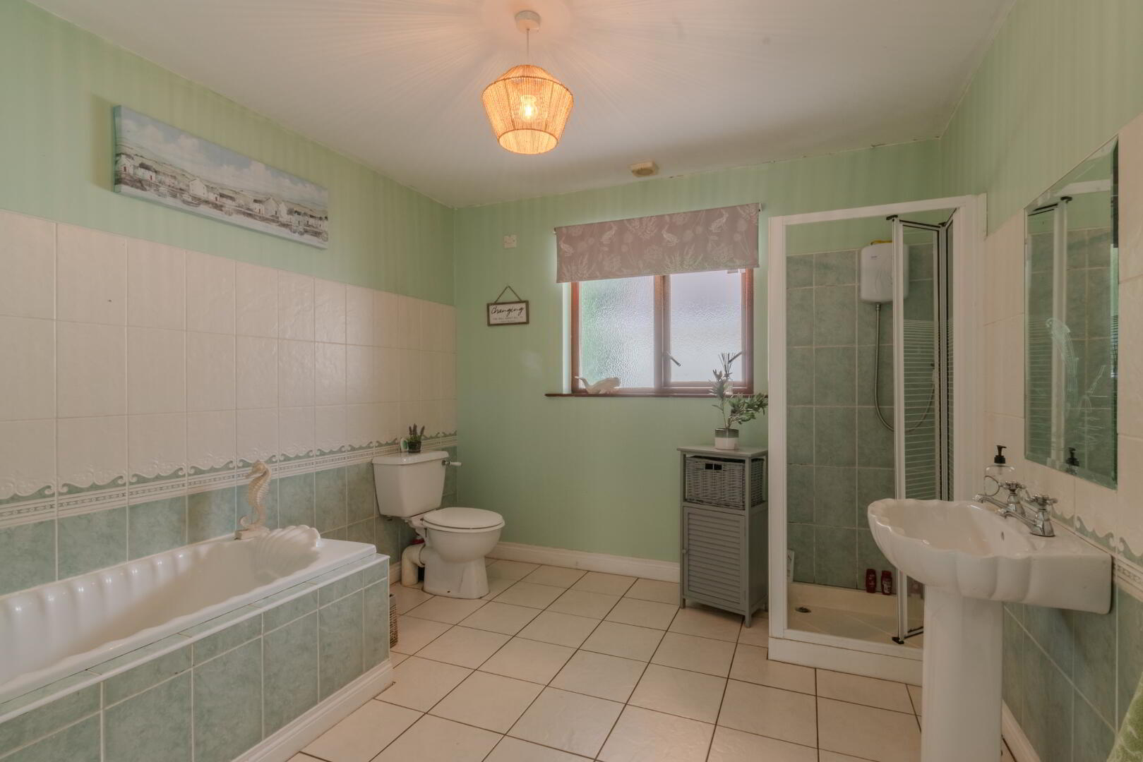 Tiled Flooring, Window to Rear, Radiator, Four Piece Suite to include Bath with Telephone Tap, Corner Shower Enclosure with Electric Shower, WC, and Wash Hand Basin.