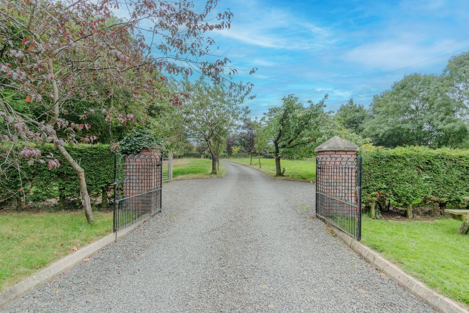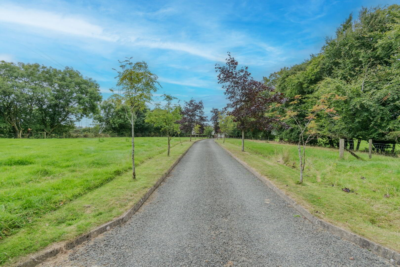 Approached via a sweeping private driveway, flanked by two paddocks and mature trees, this property makes an immediate impression. The front yard is finished in stone with a decorative well, while dual cattle grids and mature hedging at the roadside create a grand entrance. Vehicular access extends right around the property, with a concrete yard to the side and rear, complemented by a range of useful outbuildings.