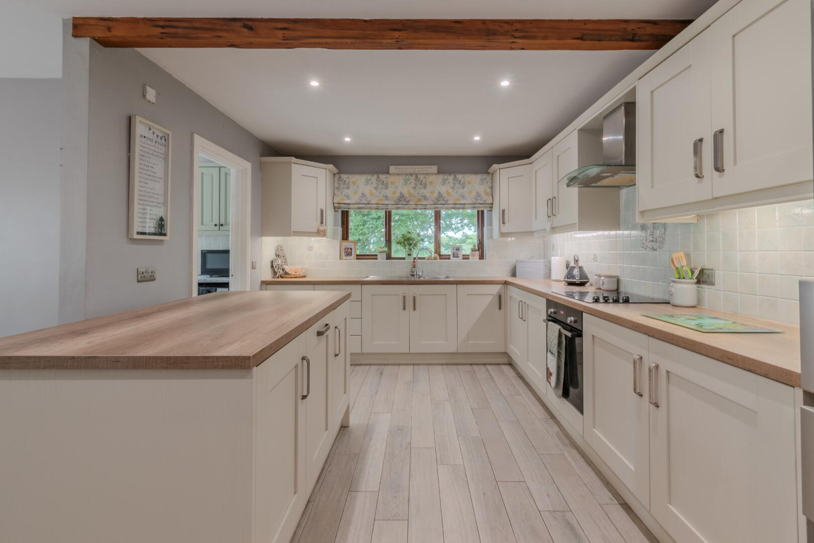Wood Effect Tile Flooring, Eye & Low-Level Shaker Style Units with Island, Wood Effect Worktop, Integrated Electric Hob & Oven, Stainless Steel 1.5 Bowl Sink & Drainer, Window to Side, Radiator, Socket Points, Recessed Spot Lighting, open to…