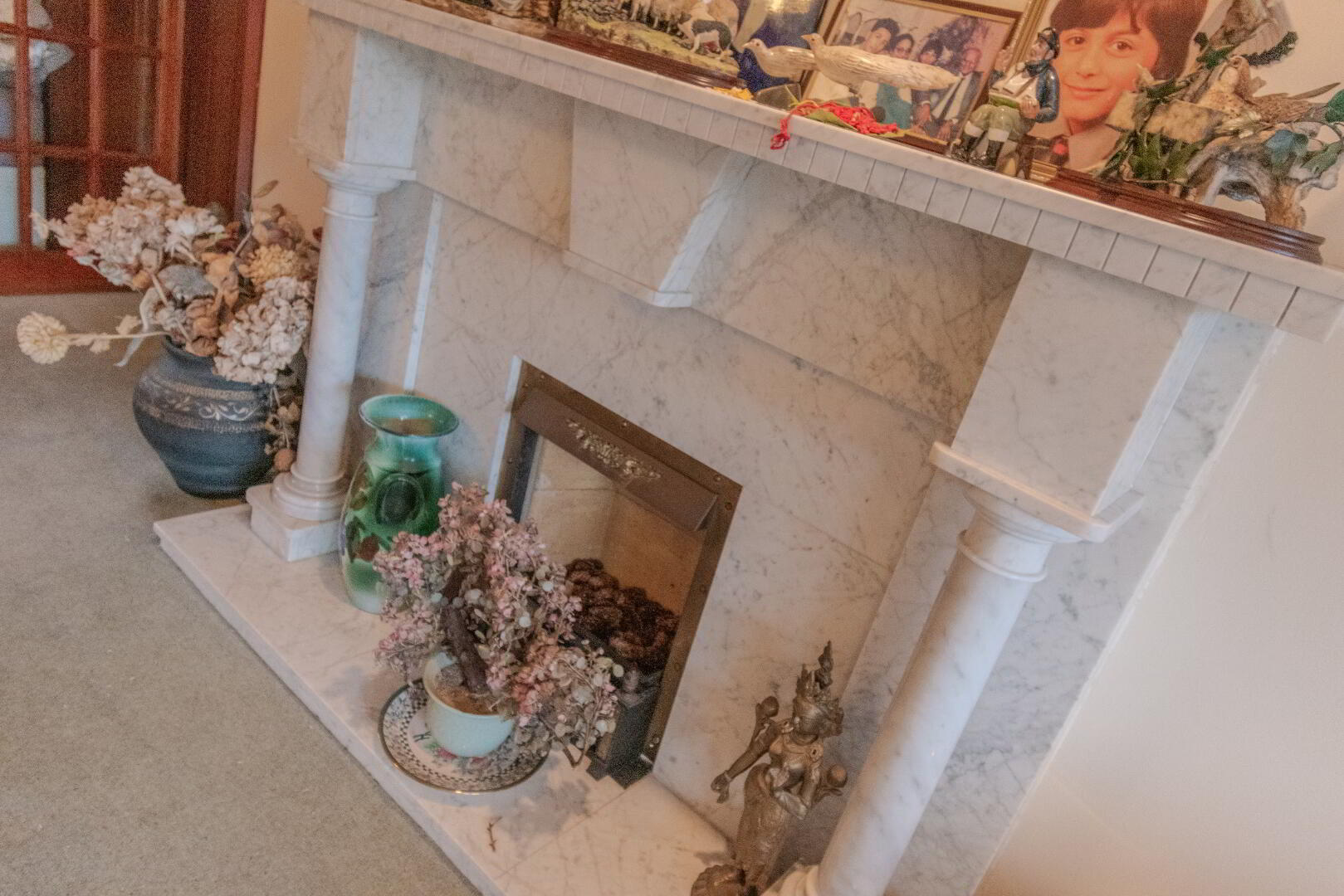Wood Effect Laminate Flooring, Vaulted Ceiling with Floor-to-Ceiling Window, Open Fireplace with Decorative Marble Surround.