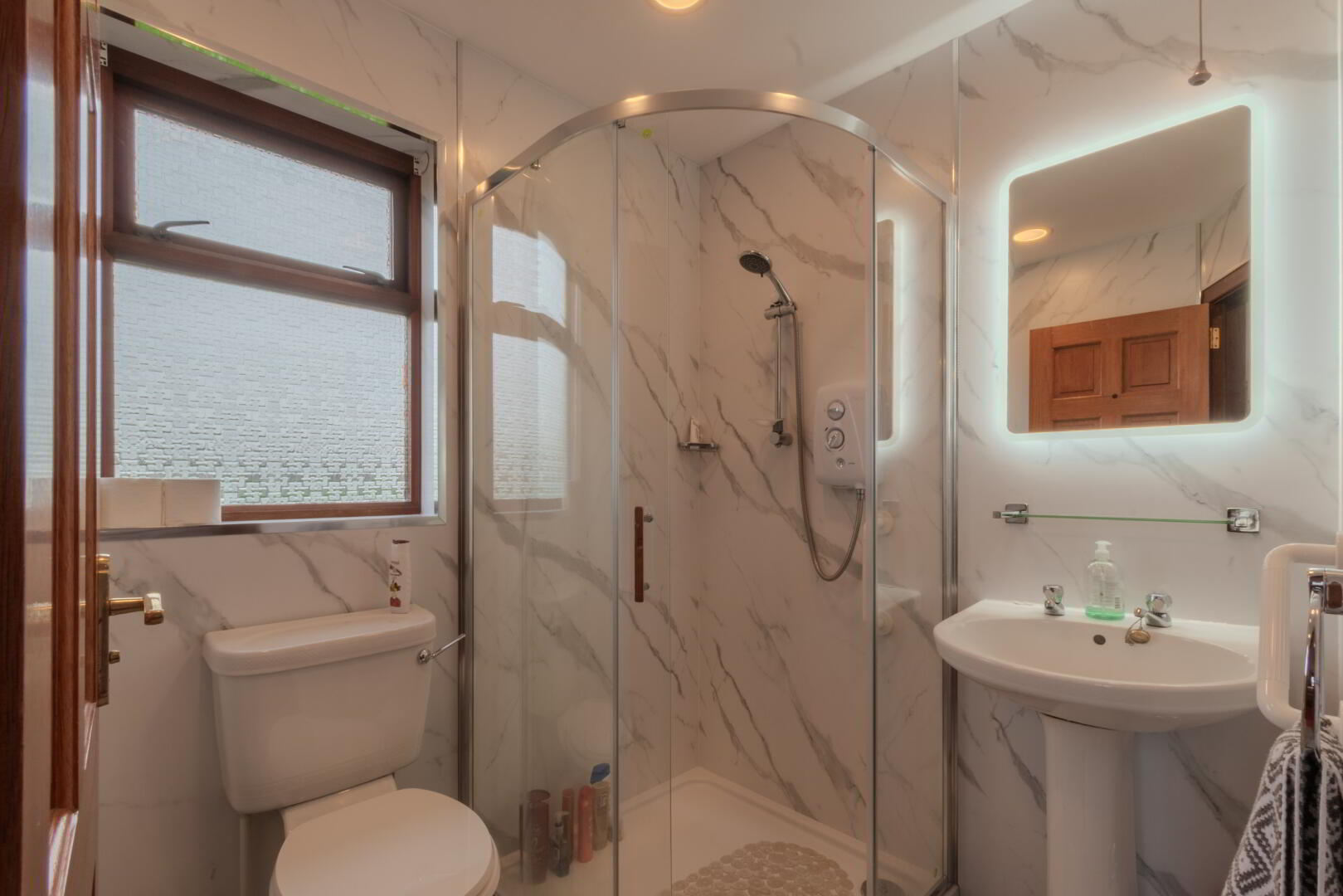 Linoleum Flooring, Fully Tiled Walls, 4-Piece Suite to include WC, Bidet, Wash Hand Basin and Shower Cubicle with Electric Shower, Storage Cupboard, Window to Side.