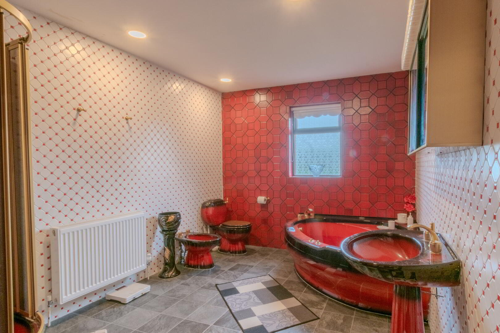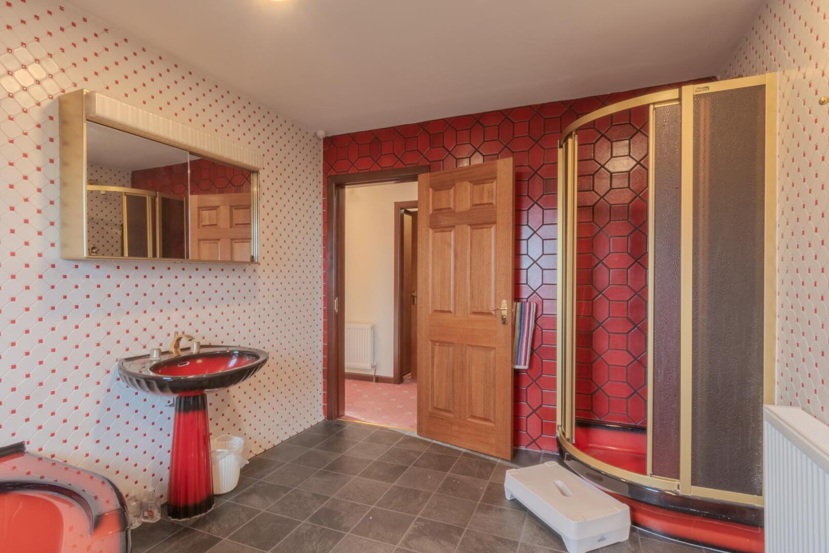 Fully Tiled Walls, Linoleum Flooring, Window to Side, 5-Piece Suite with Corner Jacuzzi Bath, Corner Enclosure with Mains Shower, Wash Hand Basin, WC & Bidet, Spot Lighting.