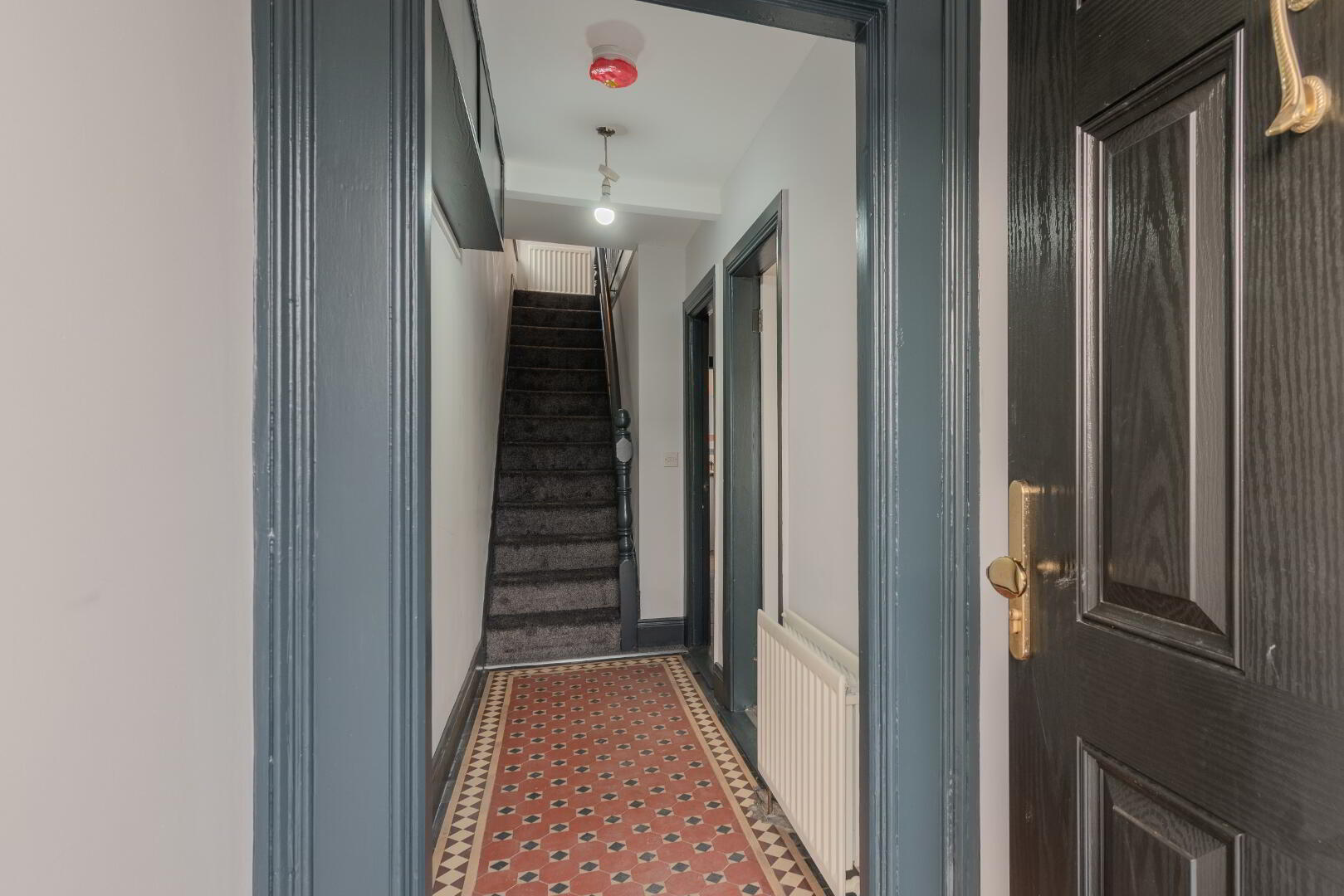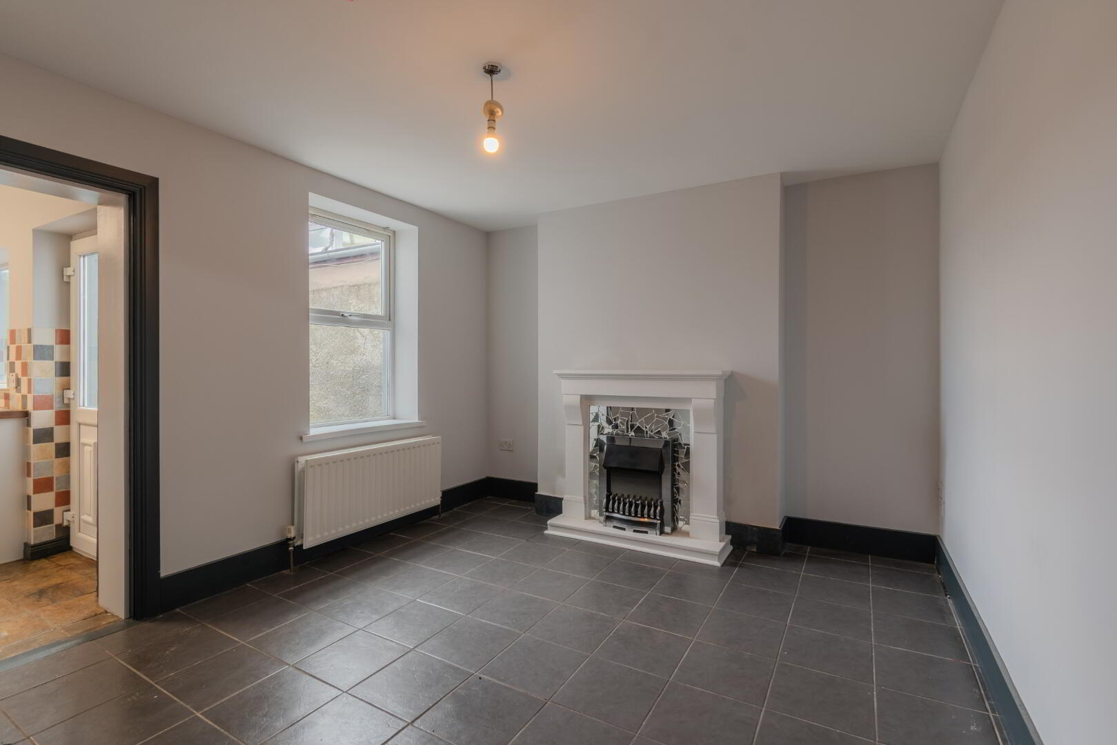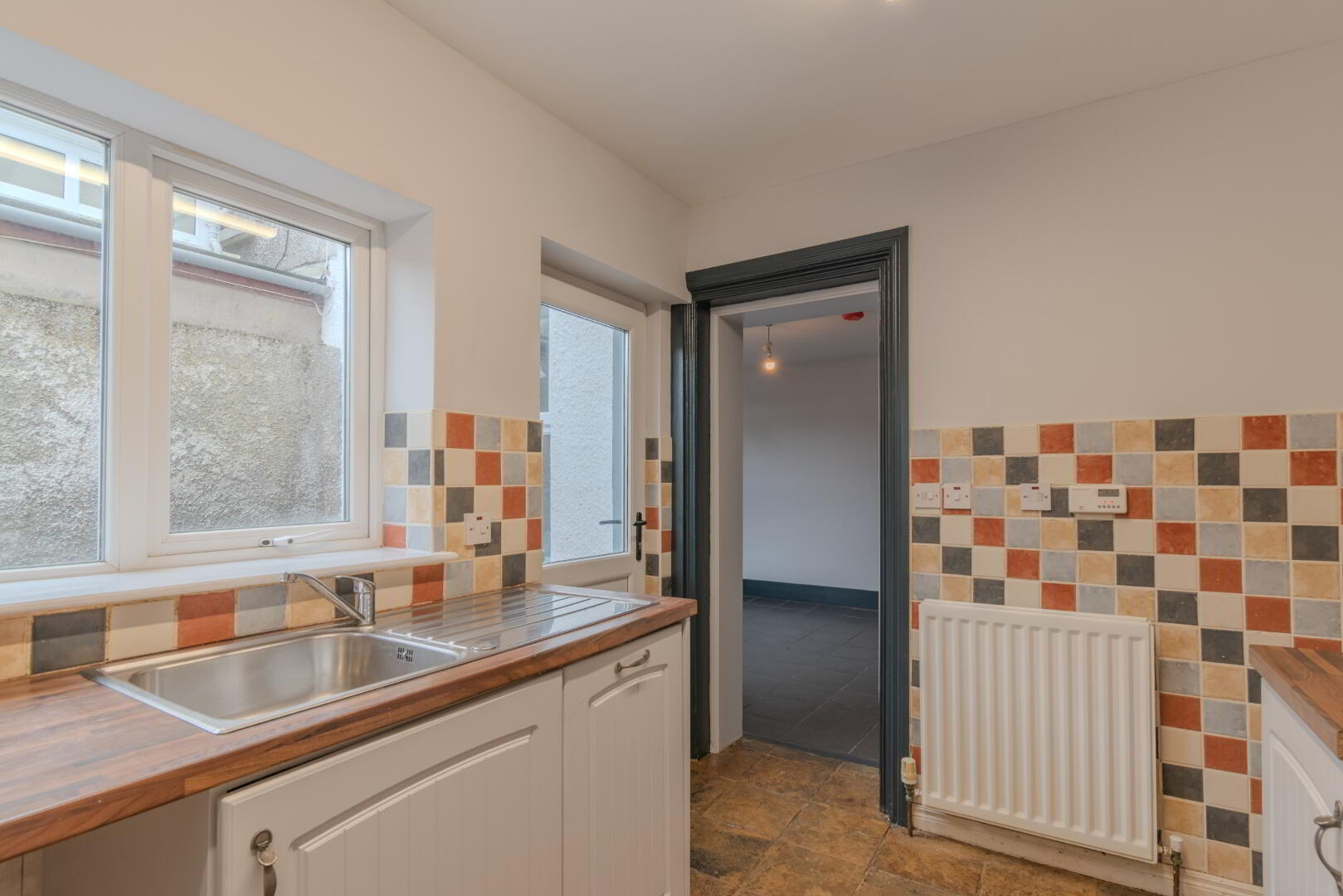 Original Tile Flooring, Radiator, Electrics Box on Wall.