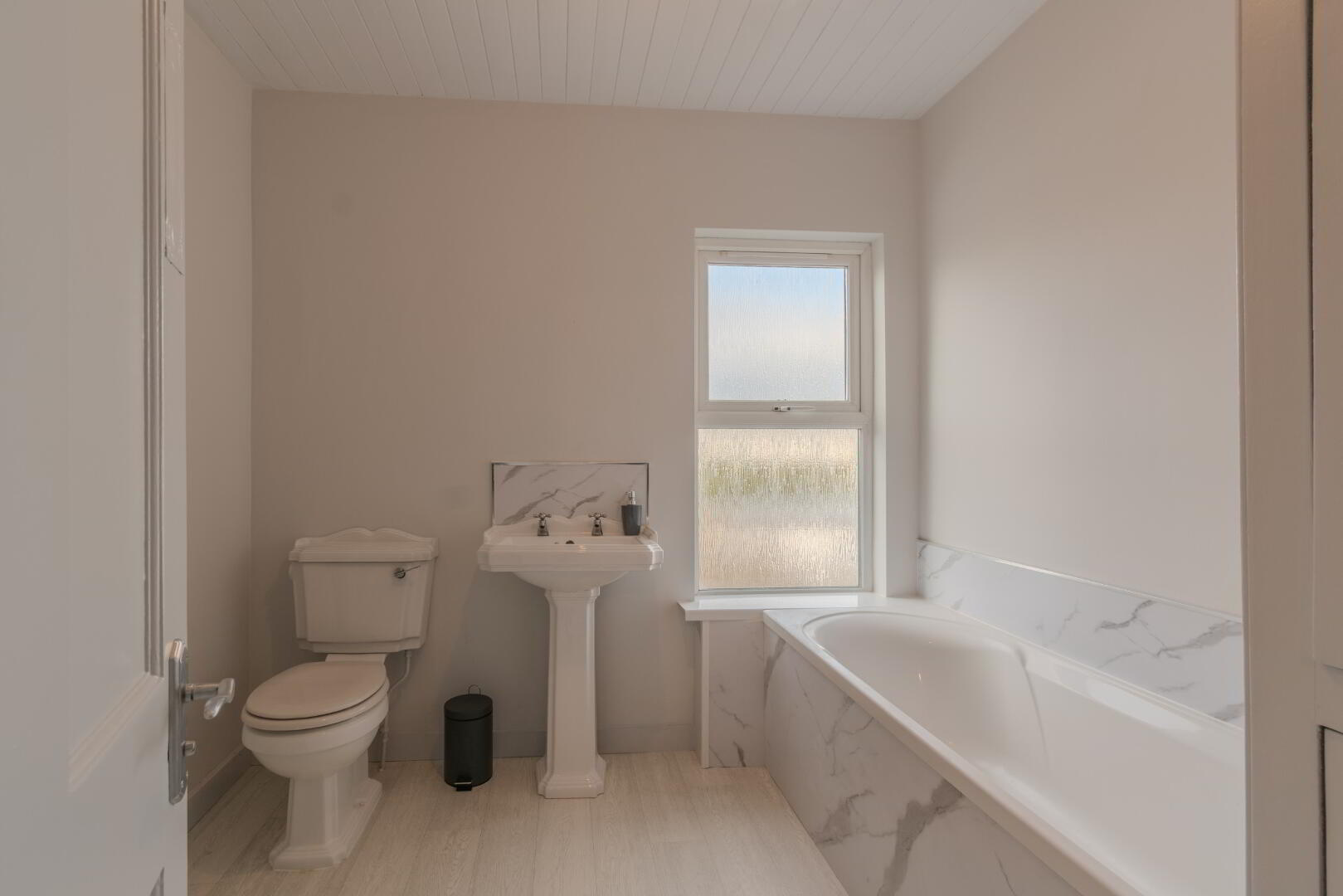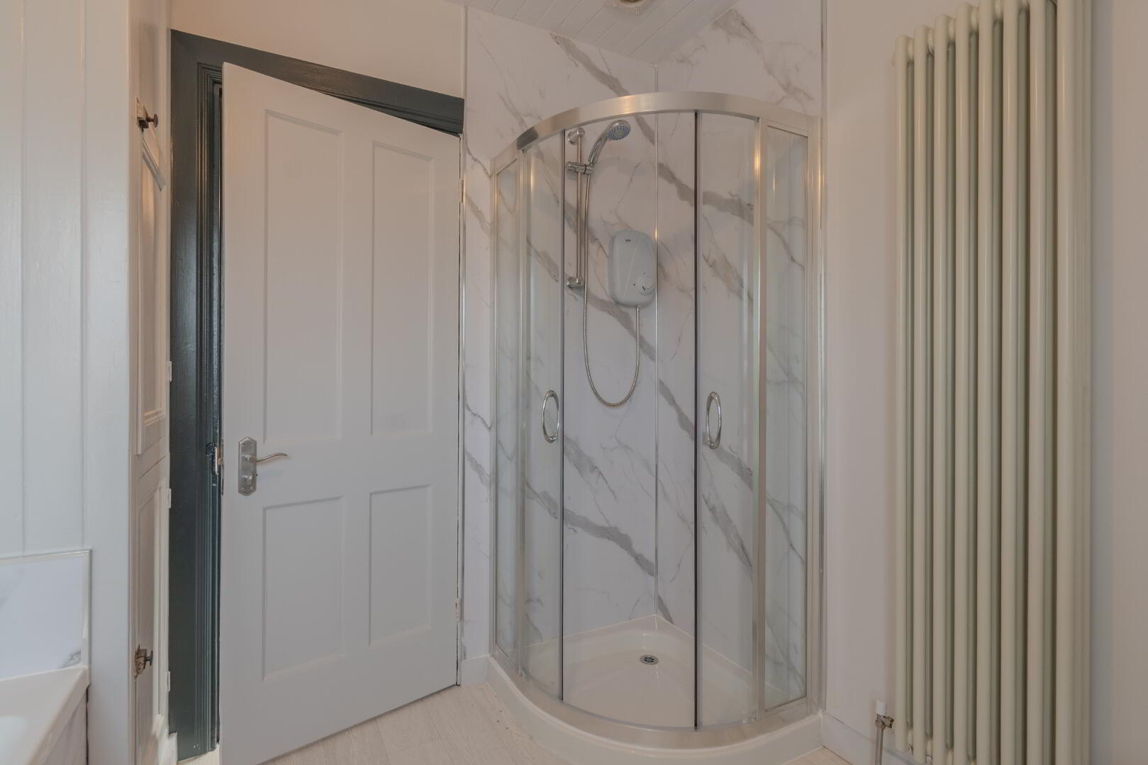 Wood Effect Vinyl Flooring, Frosted Window with Rear Aspect, Vertical Column Radiator, Hotpress Cupboard with Tank & Shelving, 4-Piece Suite to include Bath, Corner Enclosure with Electric Shower, WC and Wash Hand Basin.
