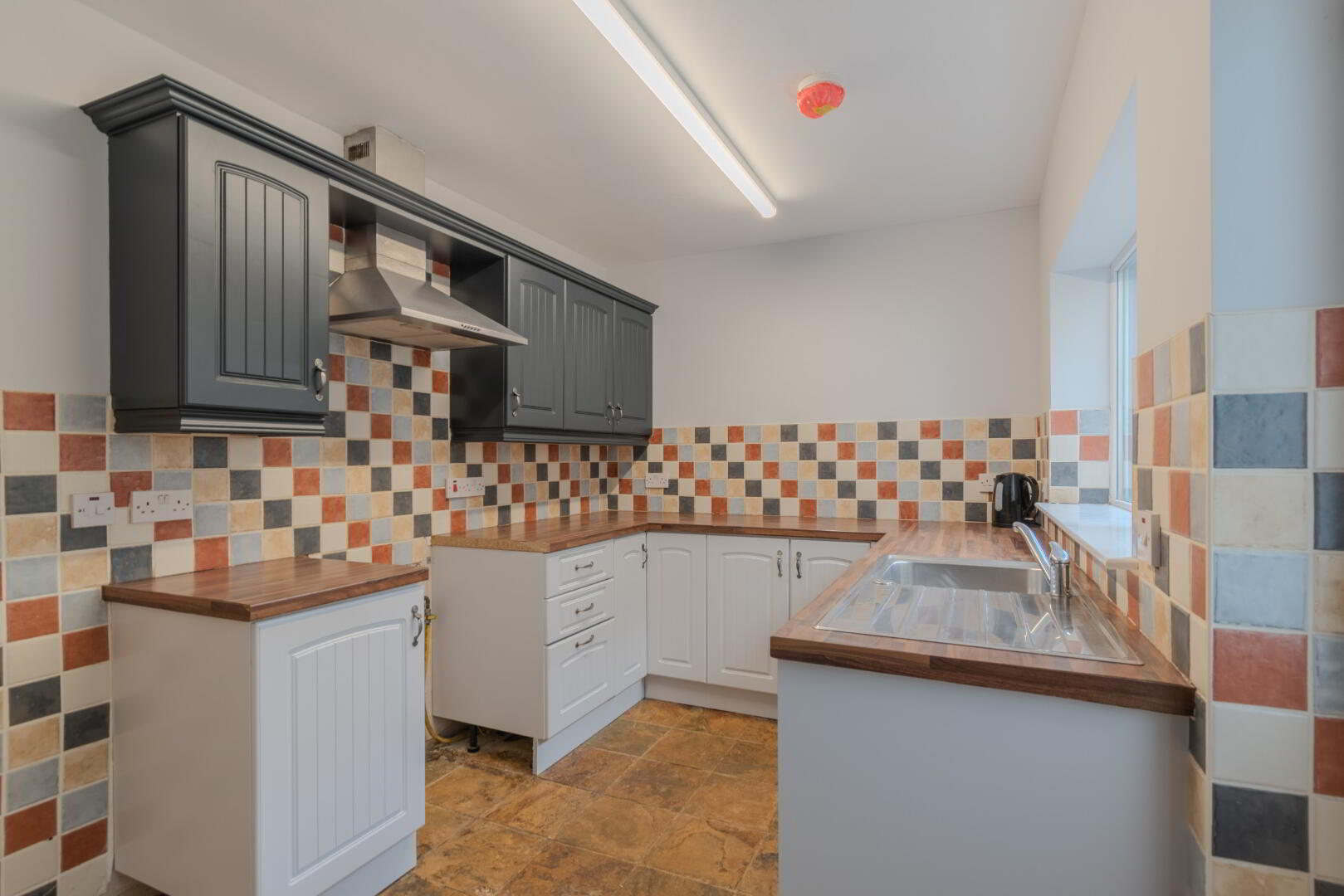 Slate Tile Flooring, ½ Tiled Walls, Eye & Low-Level Farmhouse-Style Fitted Units with Wood Effect Laminate Worktop, Window & Door to Rear Decking, Stainless Steel Sink & Drainer with Mixer Tap, Space for Cooker Unit, Plumbed for Auto, Radiator, Socket Points.
