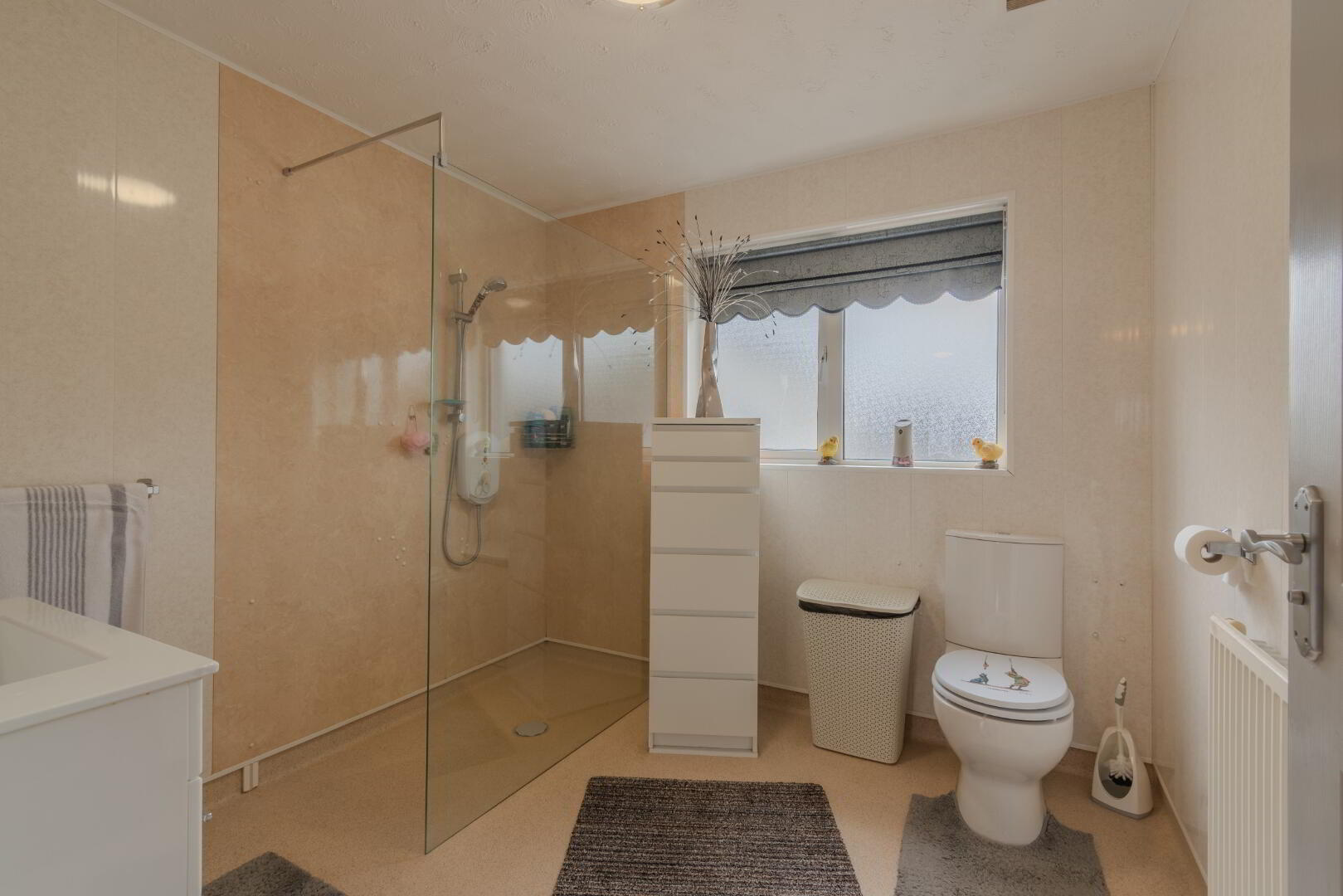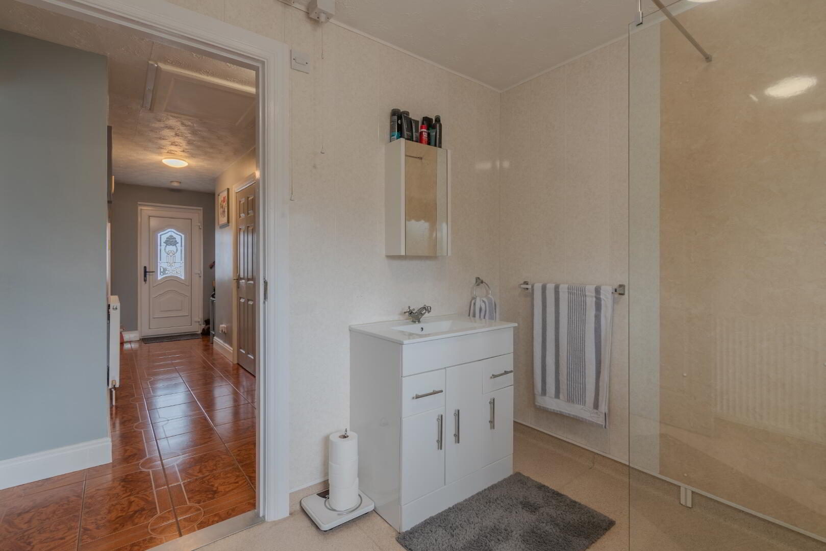Linoleum Flooring & PVC Panelled Walls, Wash Hand Basin with Vanity Unit, Low Flush WC, Walk-In Shower Enclosure with Electric Shower, Window to Rear, Radiator.