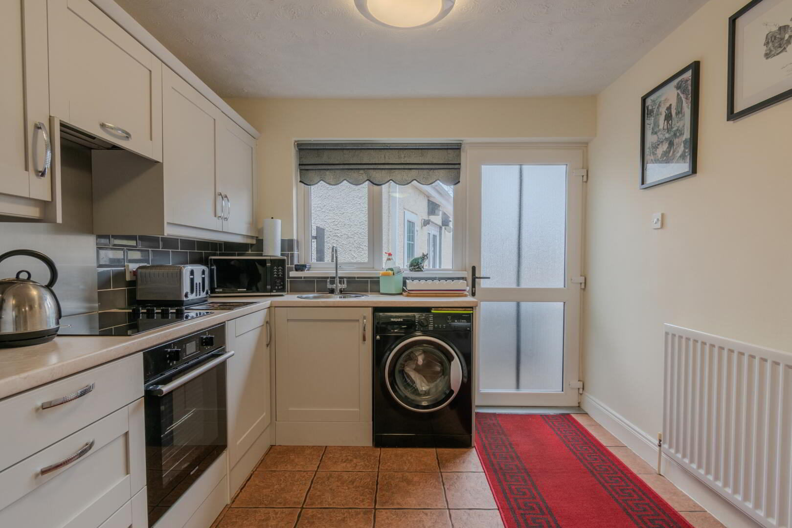 Tiled Flooring, Windows to Rear & Side, Glazed PVC Door to Rear, Eye & Low-Level Laminate Units with Larder Cupboard & Laminate Worktop, Integrated Electric Hob & Oven, Stainless Steel Sink & Drainer with Chrome Mixer Tap, Plumbed for Auto, Tile Backsplash, Radiator, Socket Points.