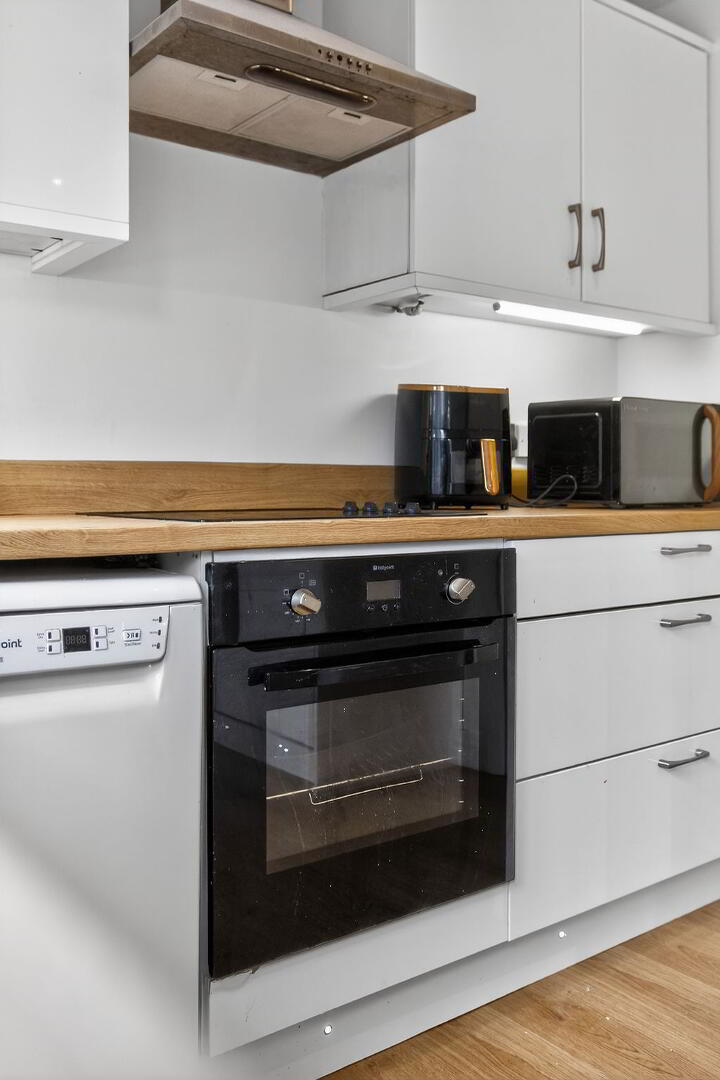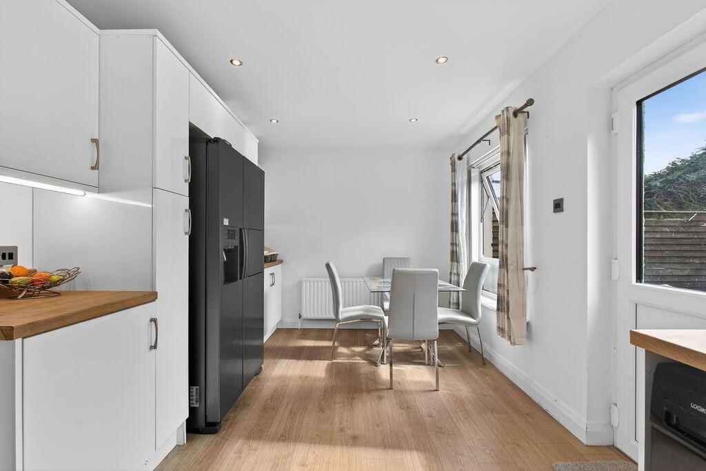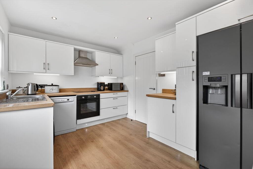 Open plan with eye and low level laminate units, wood effect laminate worktop, stainless steel sink and drainer, integrated electric hob and oven, spot lighting, 2 x windows to rear, PVC rear door with glass panels.