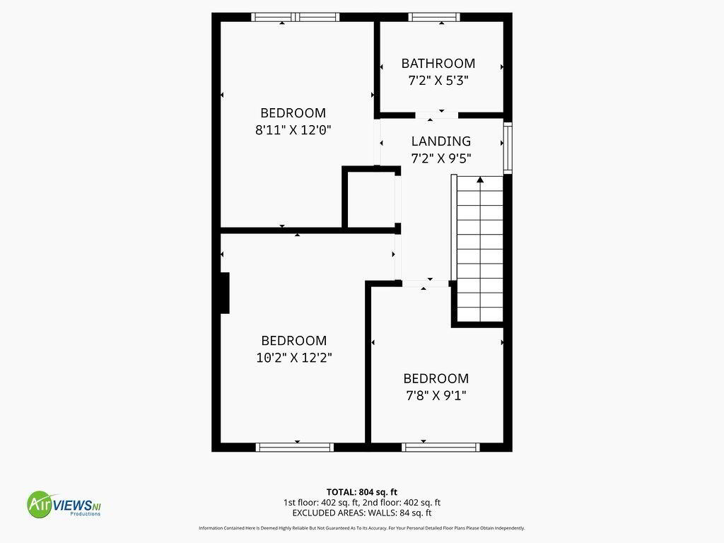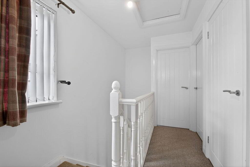 Carpeted stairs and landing, window on landing to side, hotpress, attic access, socket points.