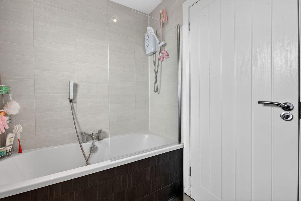 Window to rear, panelled walls, WHB, towel radiator, low flush WC, bath with telephone tap and electric shower over.