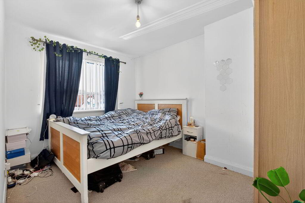 Rear of house aspect, double bedroom carpeted flooring, radiator, socket points.