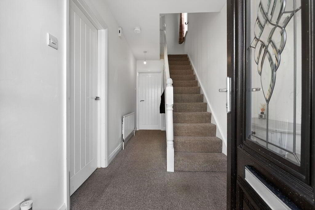 PVC front door with glass panels, carpeted flooring, electric board under stairs, radiator, double socket points.