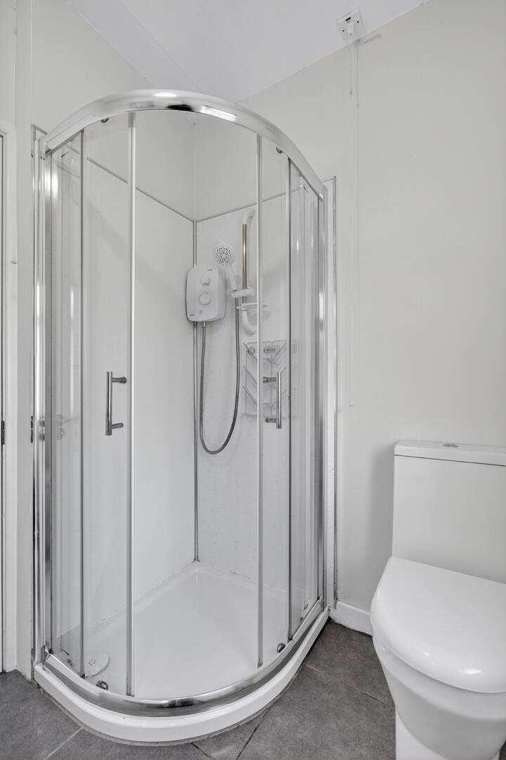 Quadrant shower cubicle with electric shower, low flush wc, wall mounted wash hand basin with mixer tap set on vanity unit with Bluetooth speaker mirror above, radiator, tiled flooring, uPVC double glazed window to rear