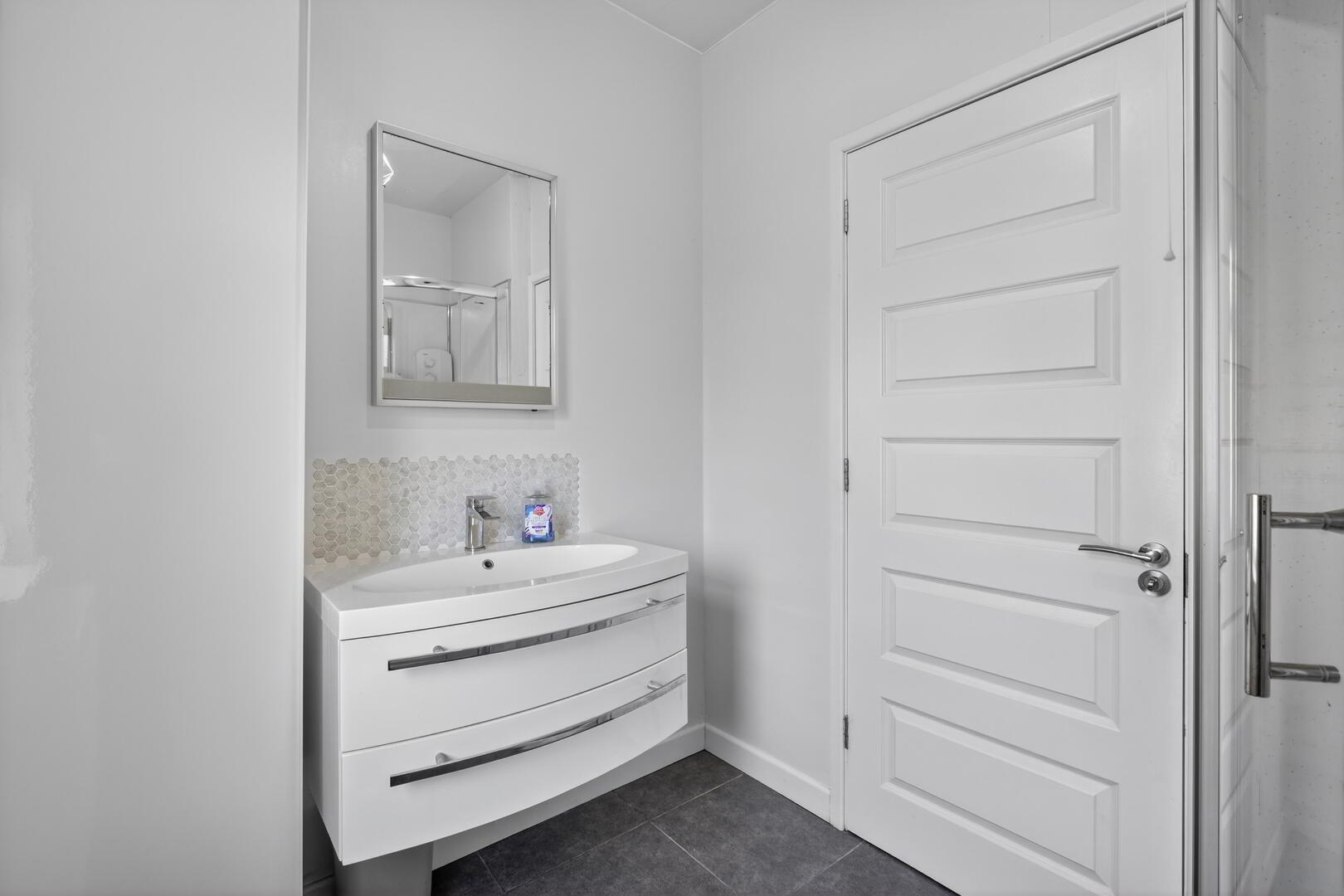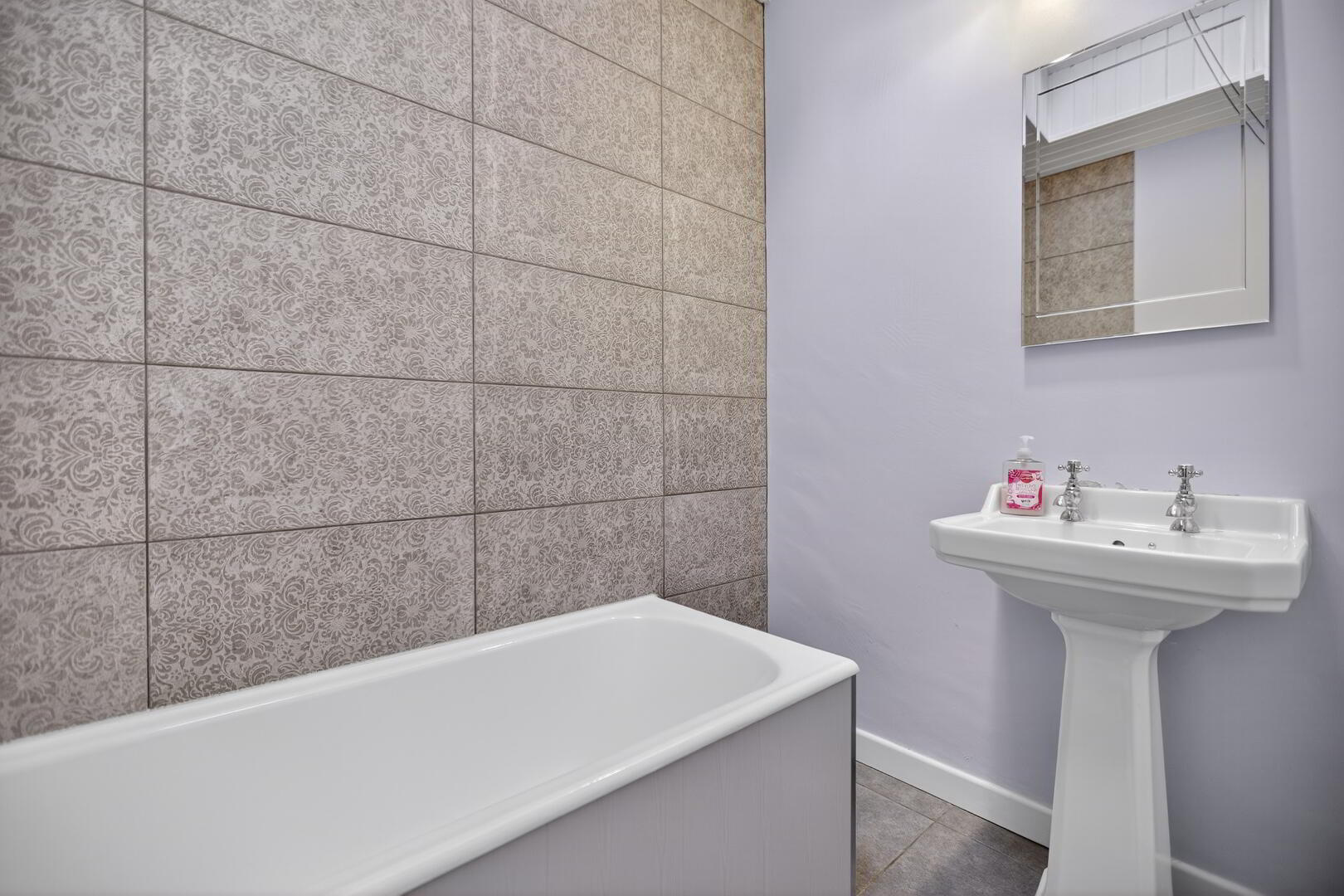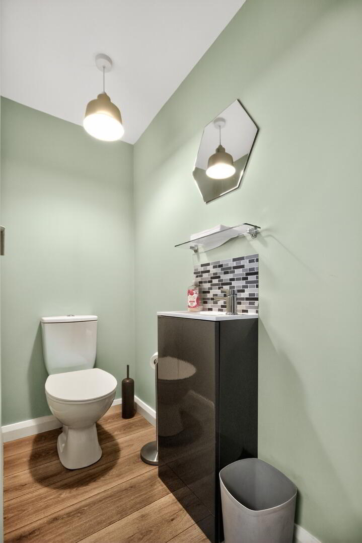 Low flush wc, wash hand basin set on vanity unit with mixer tap, laminated flooring, uPVC double glazed window to side