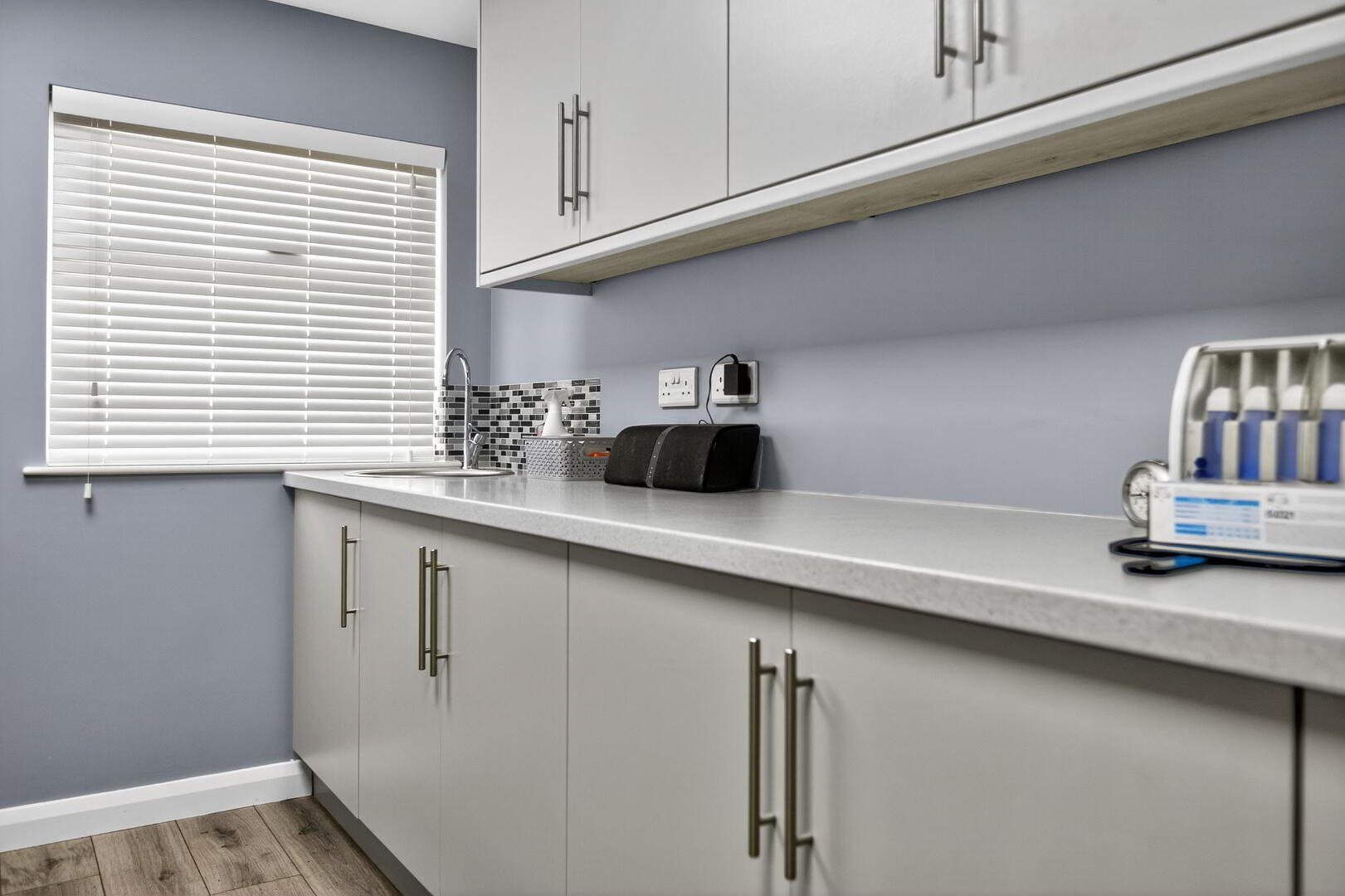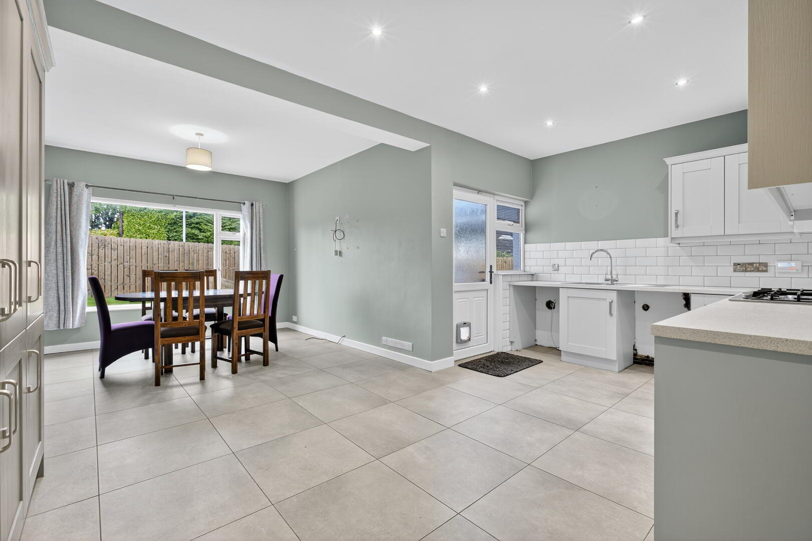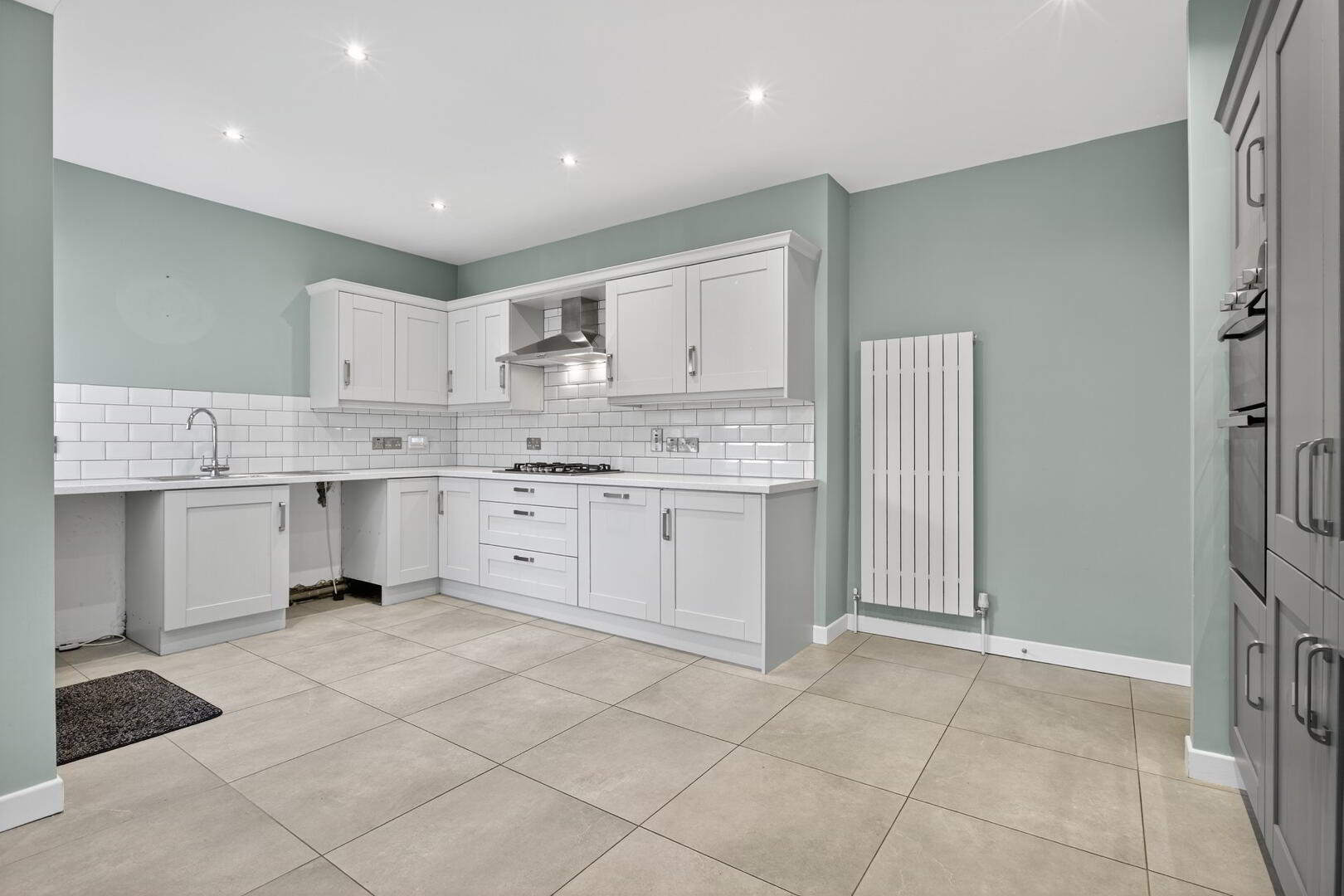 Range of shaker eye and low level units with integrated dishwasher, fridge freezer, high level double oven and grill, 5 ring gas hob, plumbed for washing machine, space for tumble dryer, 1 1/4 sink with mixer tap, uPVC double glazed window and door to rear, tiled flooring, part tiled walls, recessed LED ceiling lights, TV point