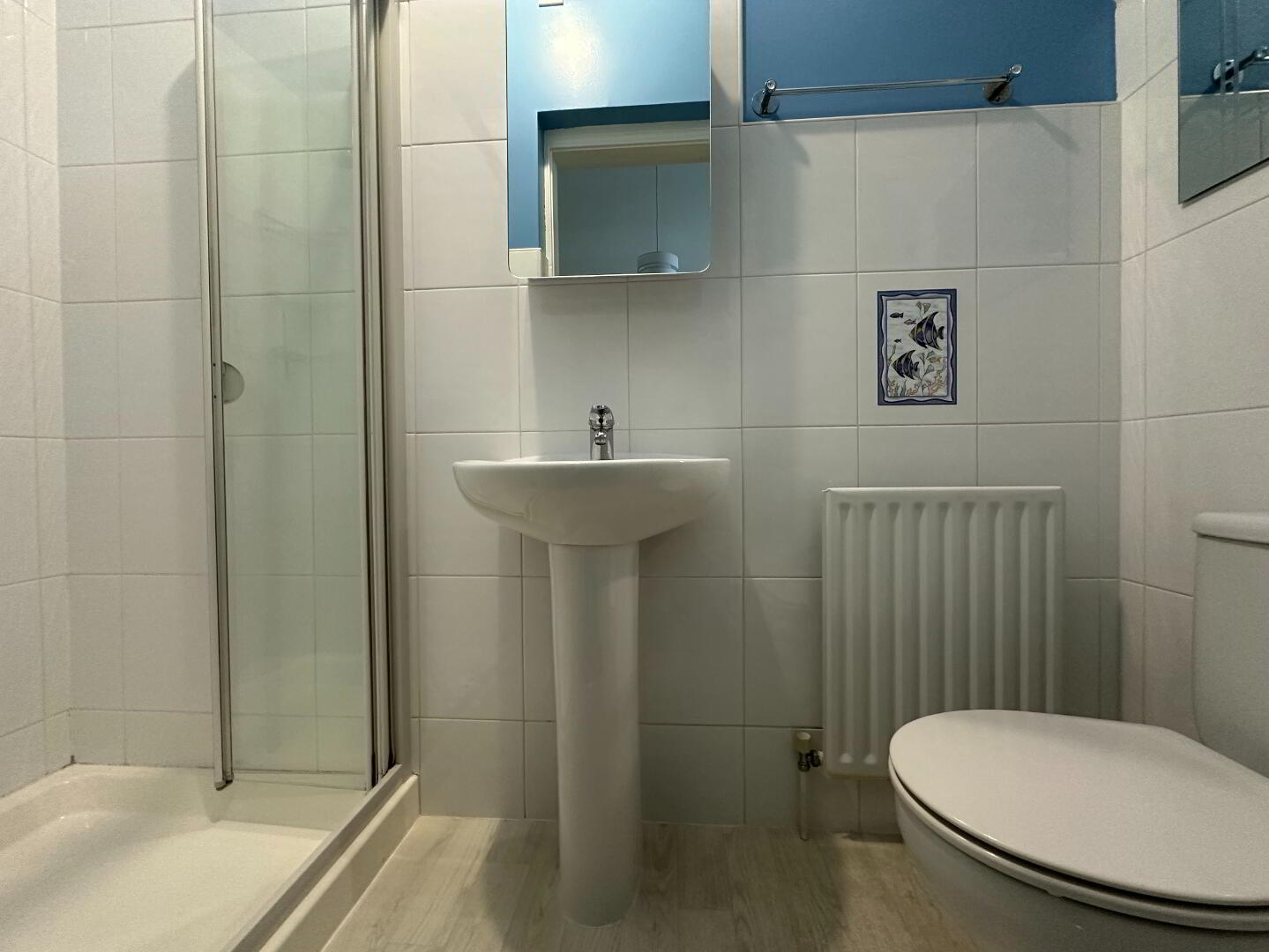 White suite comprising low flush WC, pedestal wash hand basin, panelled bath, and a separate corner shower cubicle with thermostatic shower.
