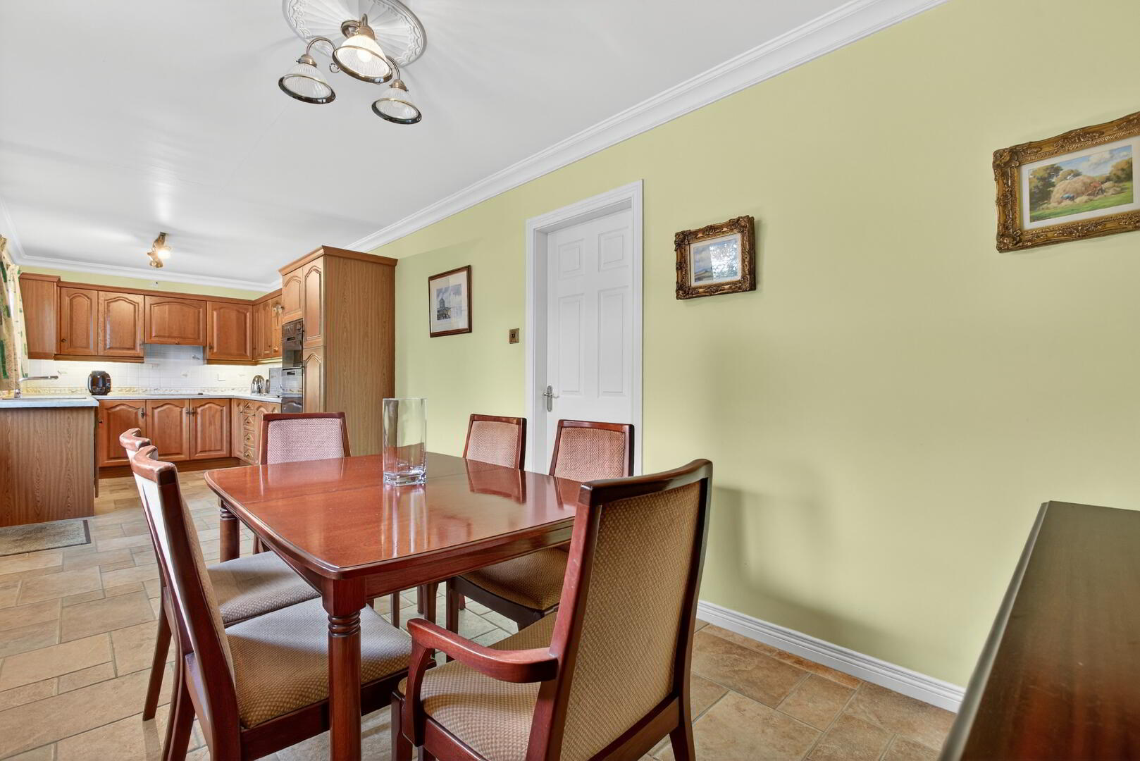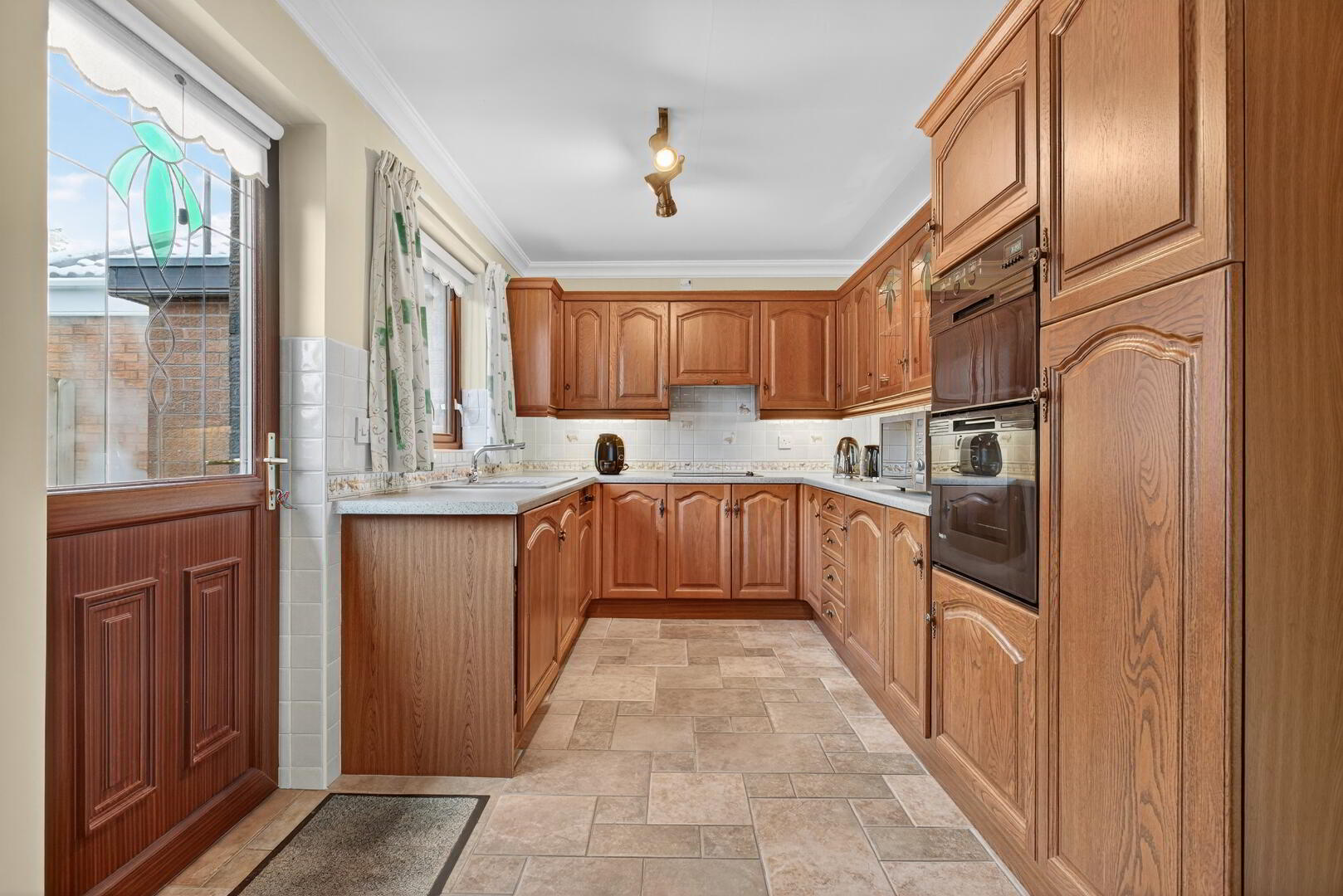 Range of eye and low level units, under unit lighting, integrated dishwasher, washing machine, under counter fridge, high level double oven and electric hob with pull out extractor hood, 1 1/4 sink with mixer tap, part tiled walls, tiled flooring, coved ceiling, ceiling rose, TV and telephone points, uPVC double glazed windows to rear and uPVC double glazed door to rear