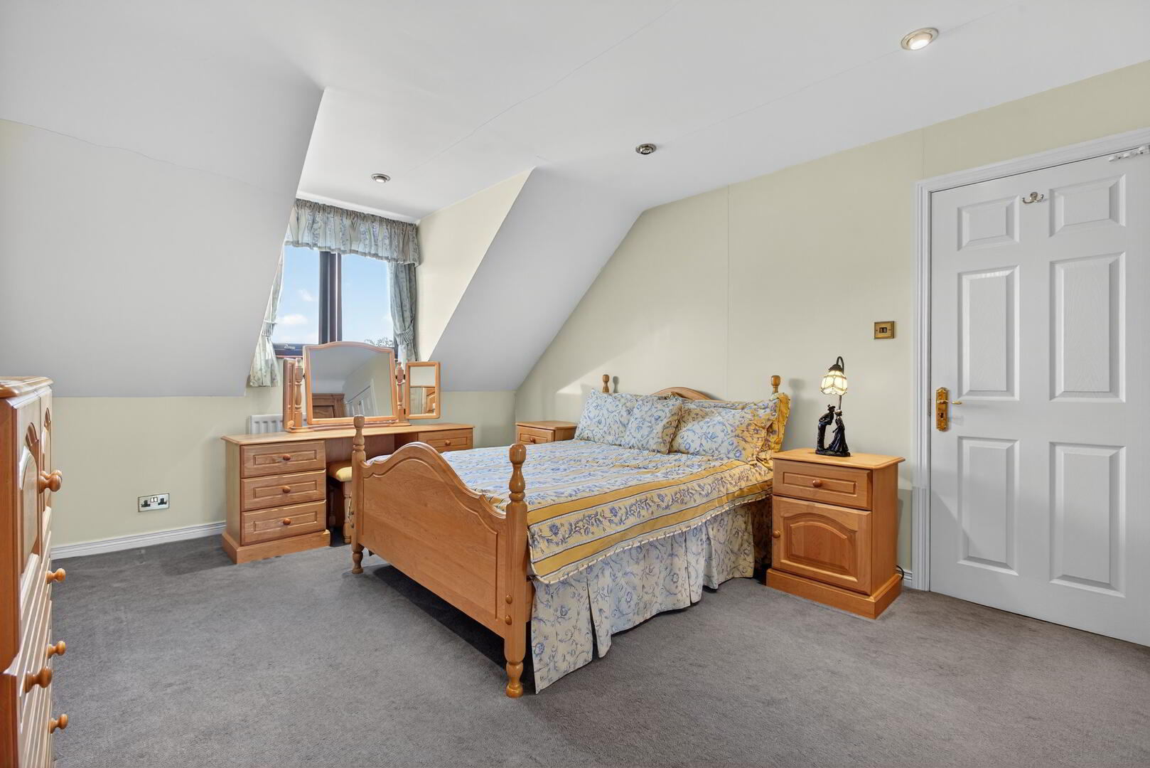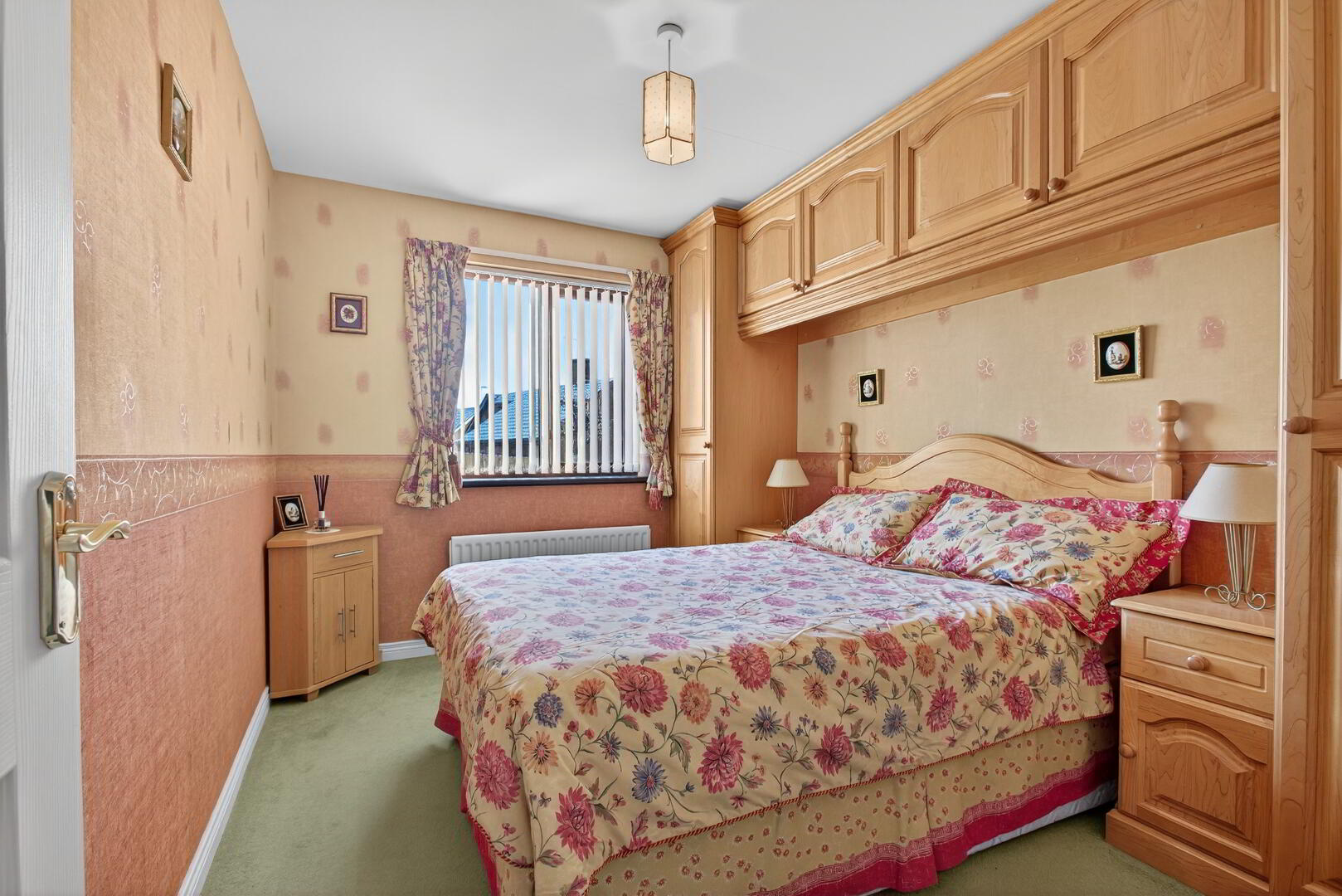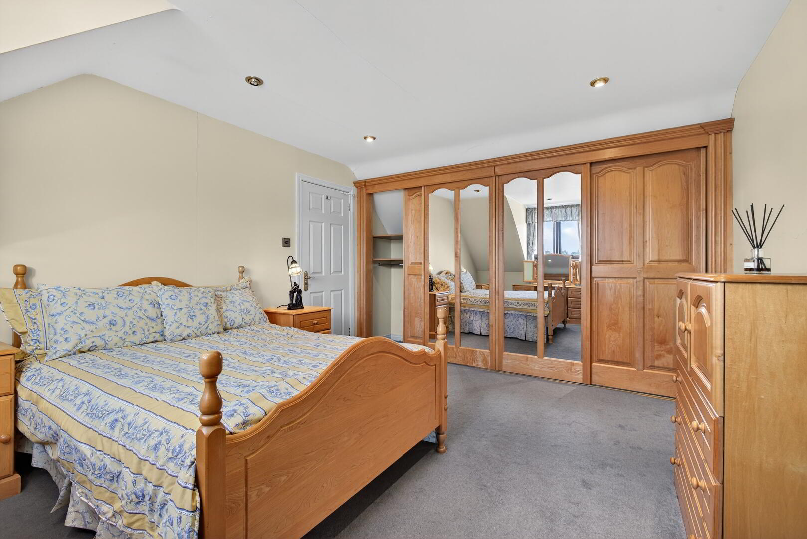 uPVC double glazed window to front, radiator, fitted slide robe with access to eaves storage, TV and telephone points, recessed ceiling lighting