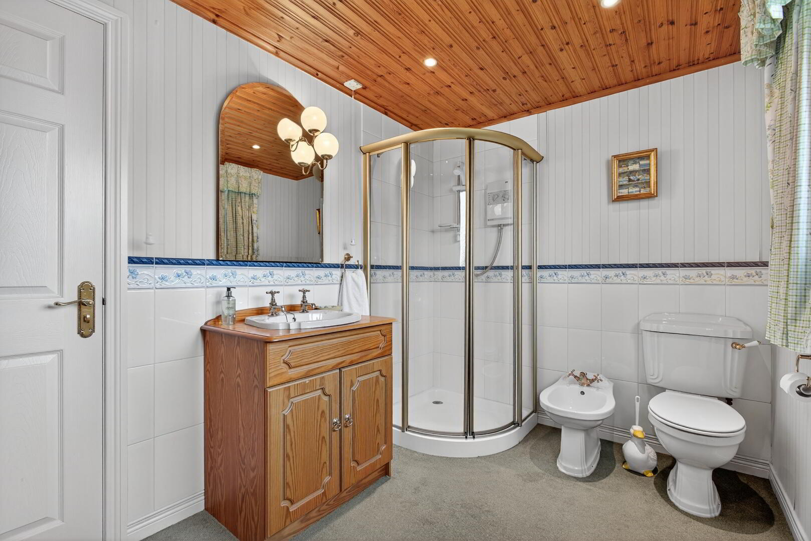 Quadrant shower cubicle with Mira Sport electric shower, wash hand basin set on vanity unit, low flush wc, bidet, part tiled walls, radiator, recessed ceiling lighting, uPVC double glazed window to rear