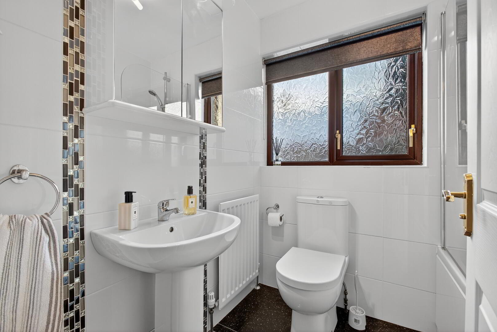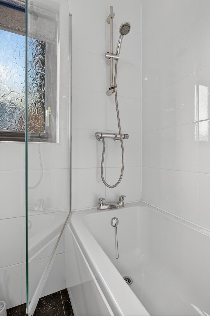 Bath with mixer tap, shower screen and thermostatic shower, low flush wc, pedestal wash hand basin, fully tiled walls and flooring, radiator, uPVC double glazed window to side