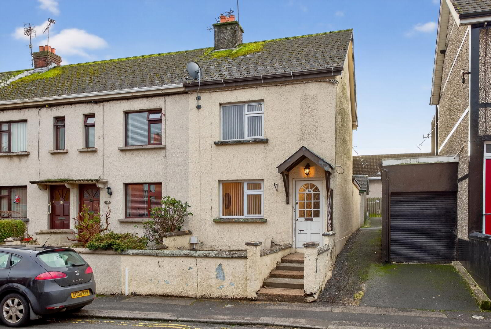 The front of the property features steps leading to an elevated entrance, while the rear benefits from an enclosed yard.