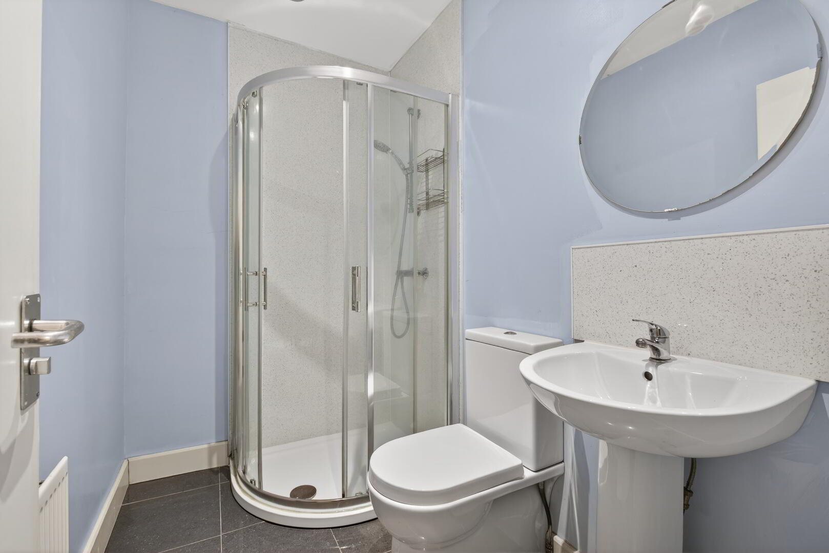Quadrant shower cubicle with thermostatic shower, low flush wc, pedestal wash hand basin, radiator, tiled flooring, recessed ceiling lighting