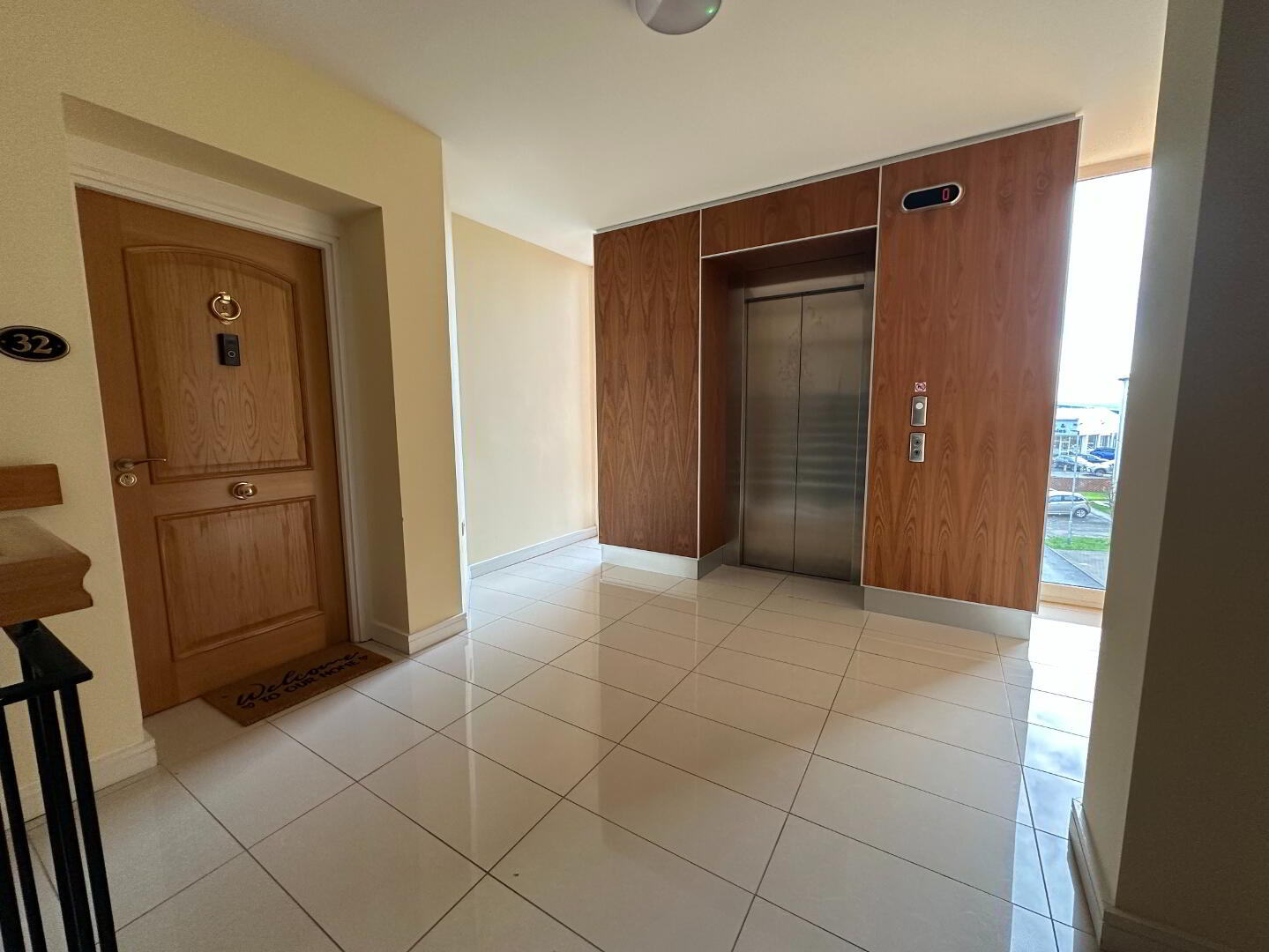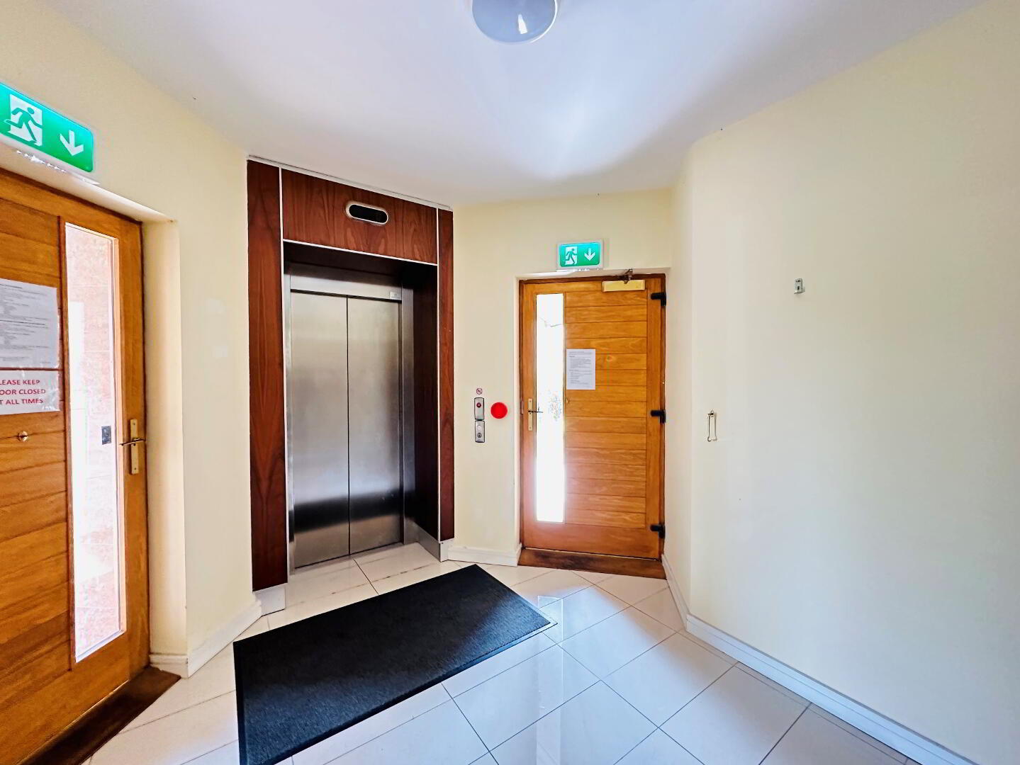 The property benefits from secure entry via a phone access system, opening into a communal hallway with both lift and stair access to the upper floors. Inside, a hallway leads to a generous open-plan lounge, kitchen, and dining area, all furnished and ready for immediate occupancy. The apartment includes a family bathroom and three well-proportioned double bedrooms, with the master featuring an ensuite.
