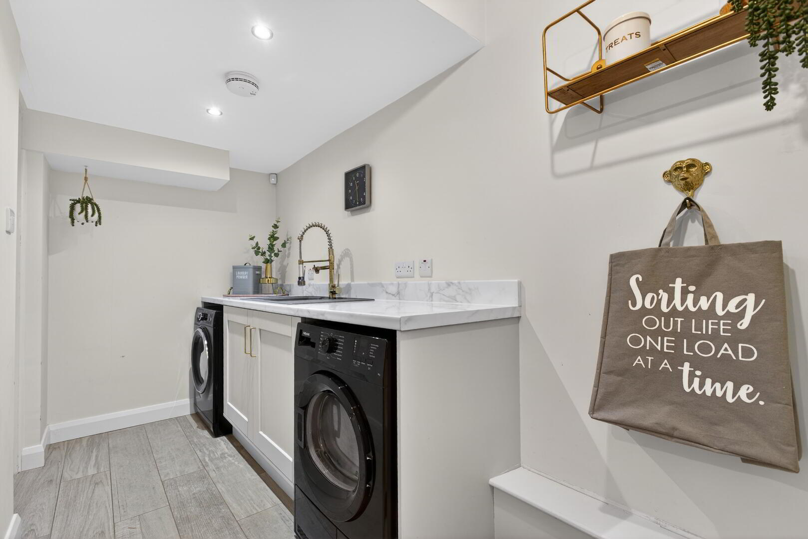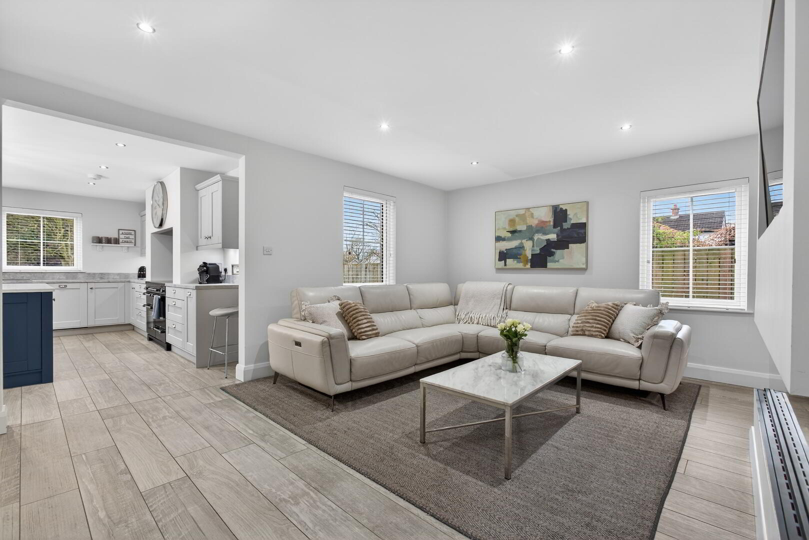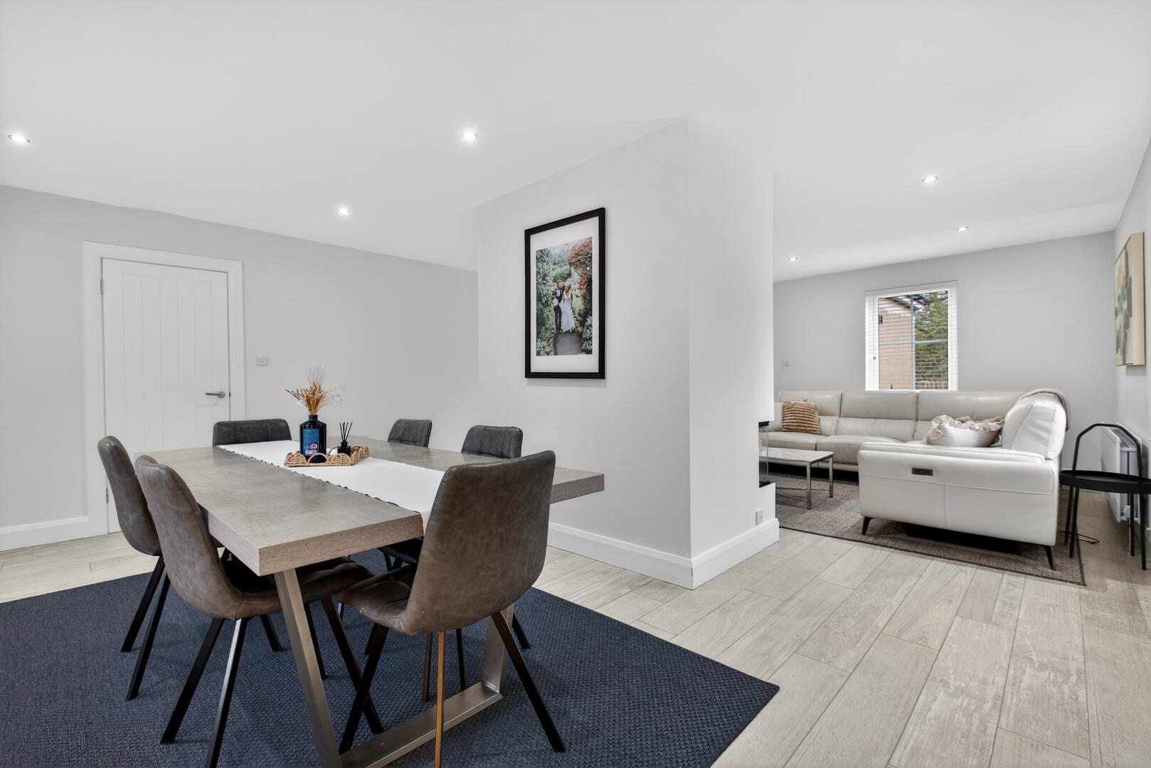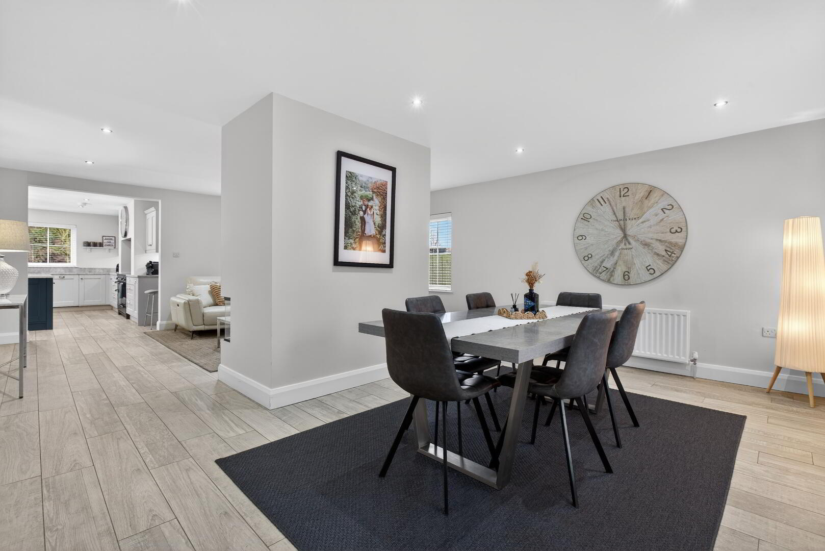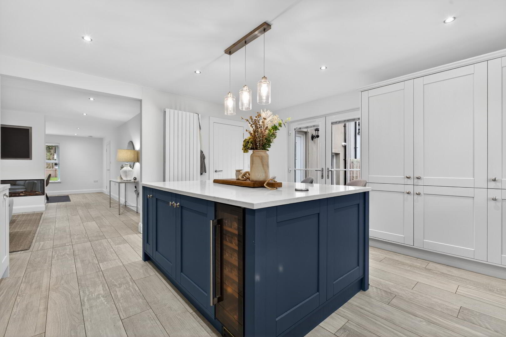 With wood plank effect tiled flooring extending through