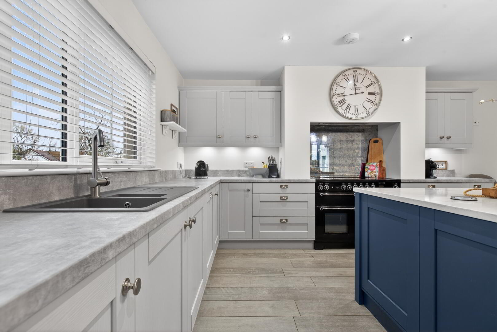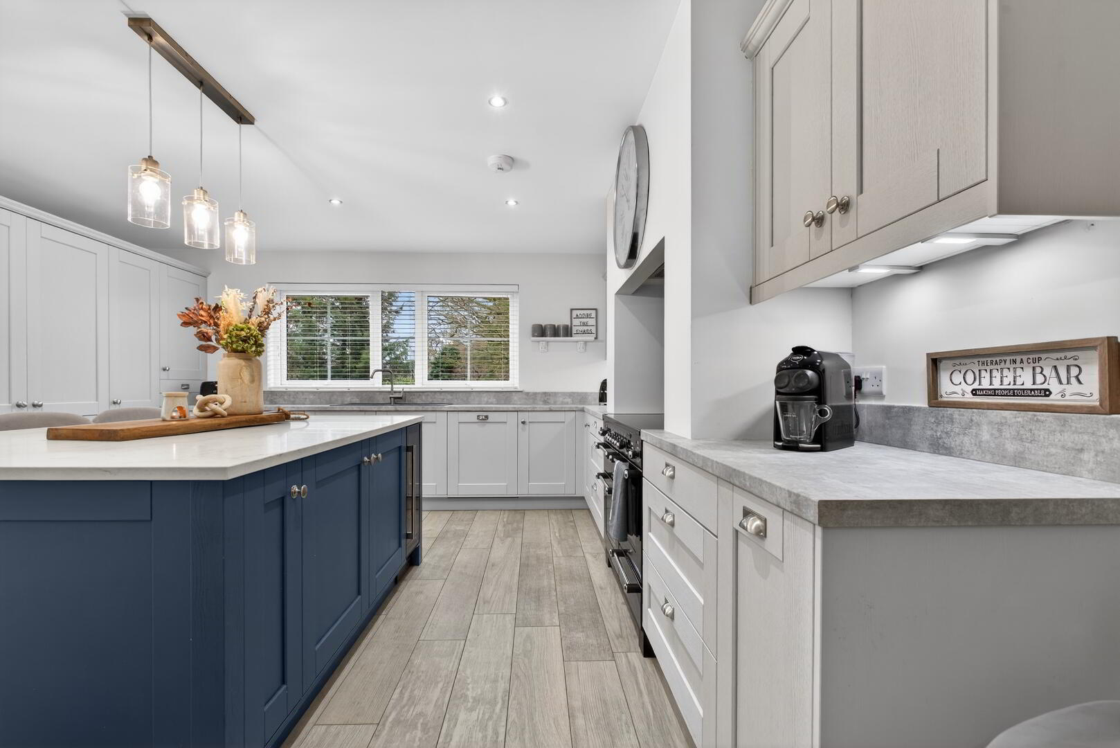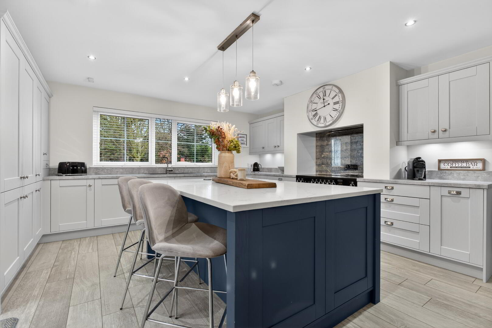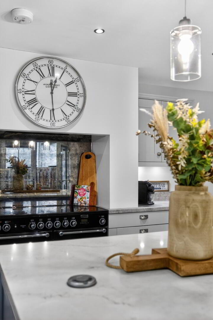 The ground floor features an entrance hall with a cloak’s cupboard, separate WC and understairs storage and leads to the spacious open plan living dining space which includes a centred media wall with wraparound log burning effect electric fire and tiled flooring extending through. The kitchen which leads off this area, is completed with shaker style cabinetry, a range of integrated appliances, a Rangemaster cooker and an Island unit with granite worksurface and seating recess. A utility/laundry room is also accessed off this area.