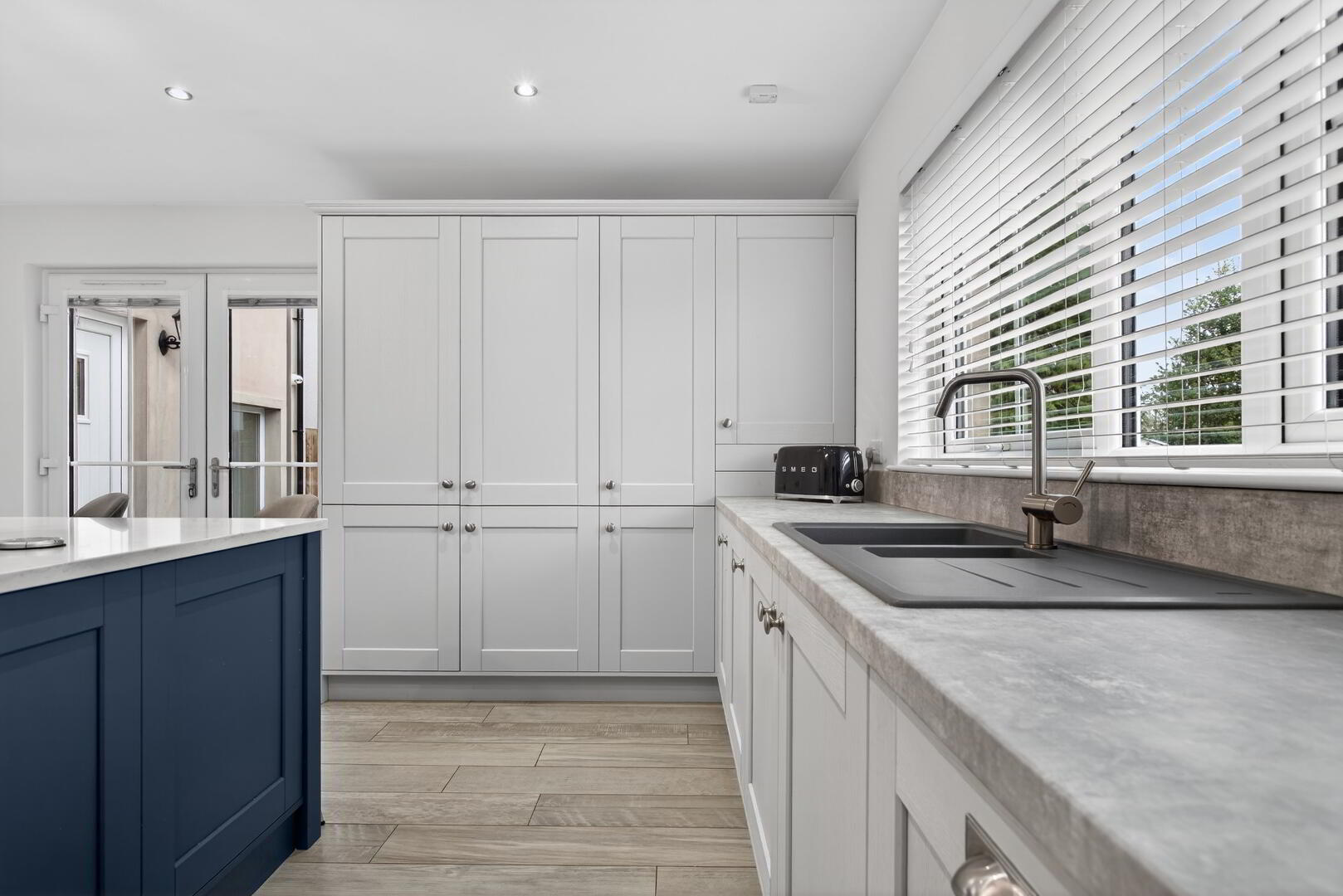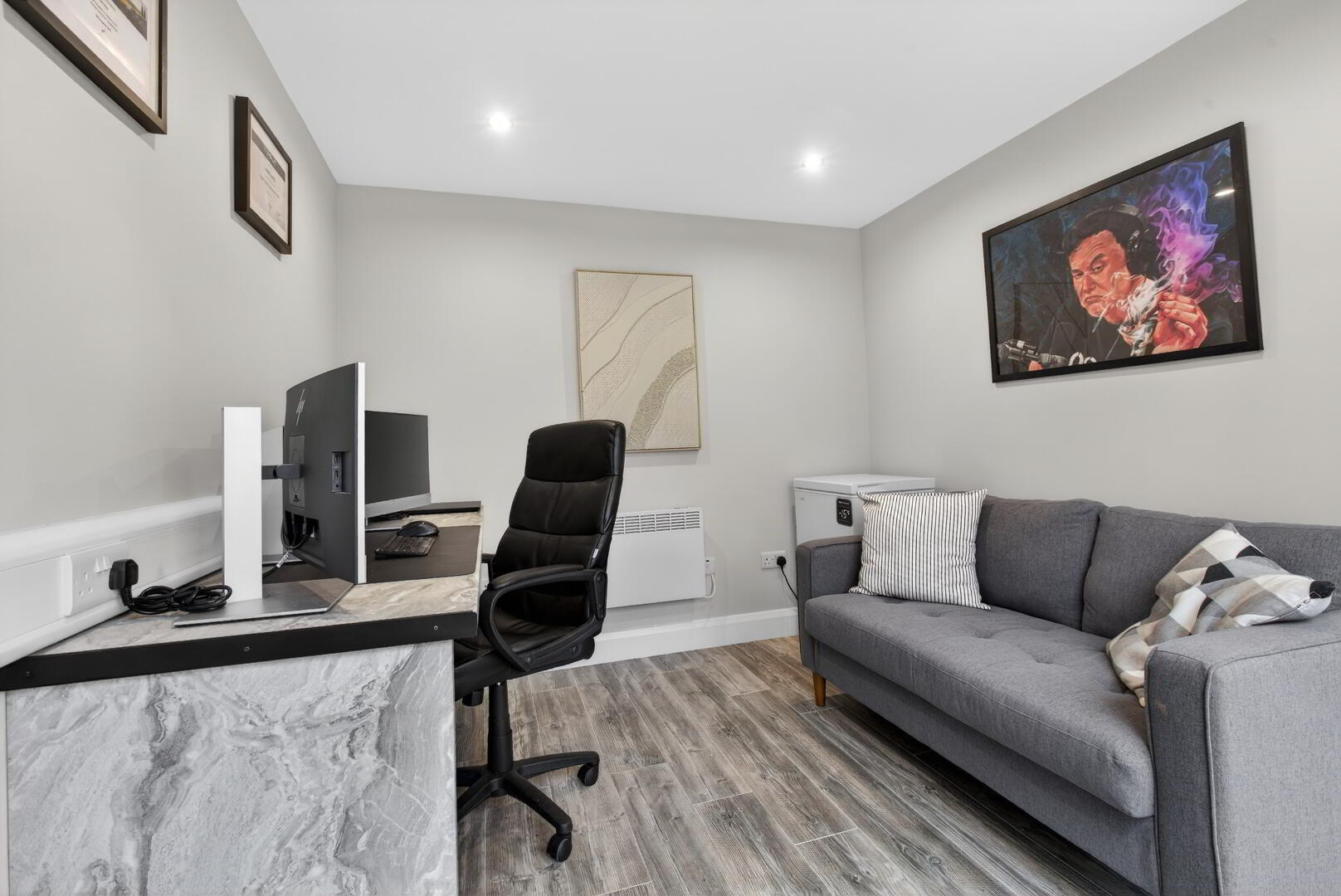 With glazed door and full length glazed window, wall mounted electric heater, data point, grey wood effect flooring