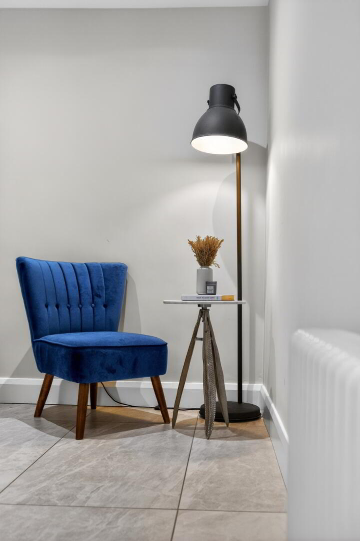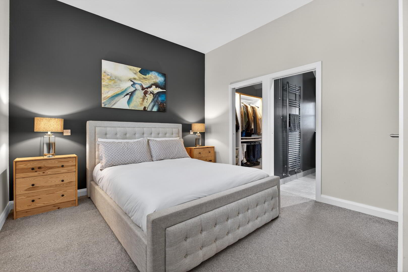 A split-level landing leads to the master bedroom suite on one side which benefits from a walk in dressing area and ensuite shower room. The spacious bathroom comprises of a step-in shower and freestanding bath with a floor mounted mixer tap.