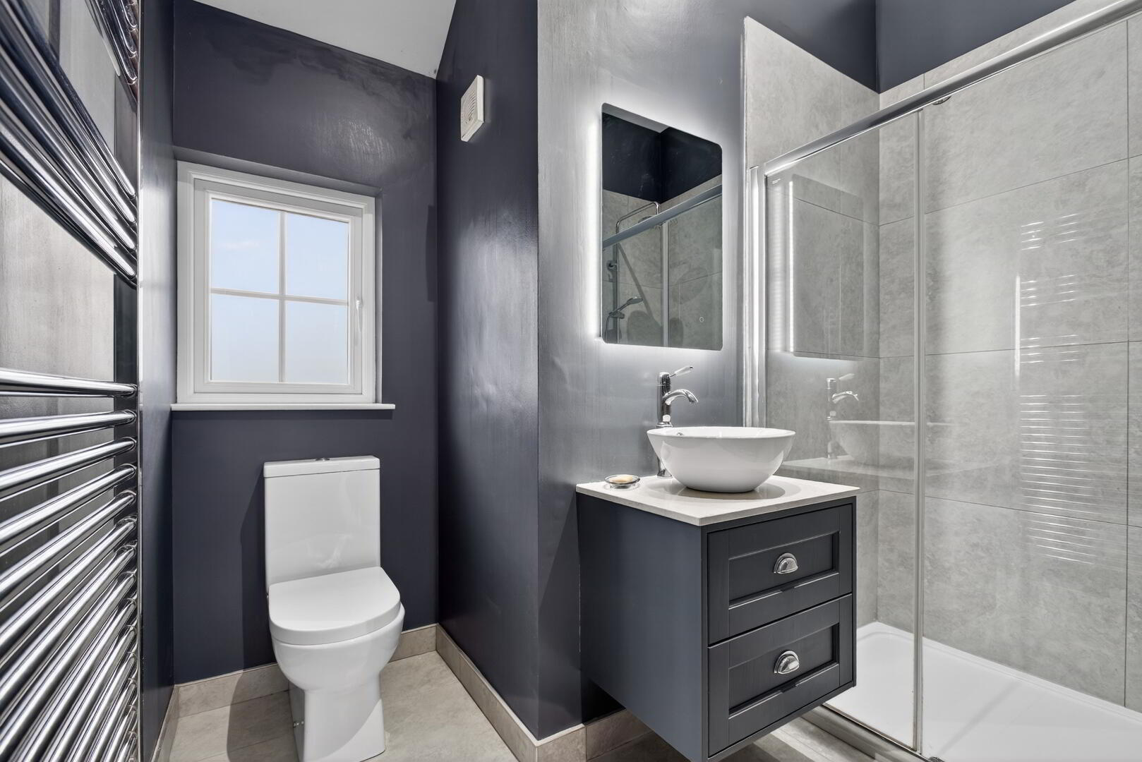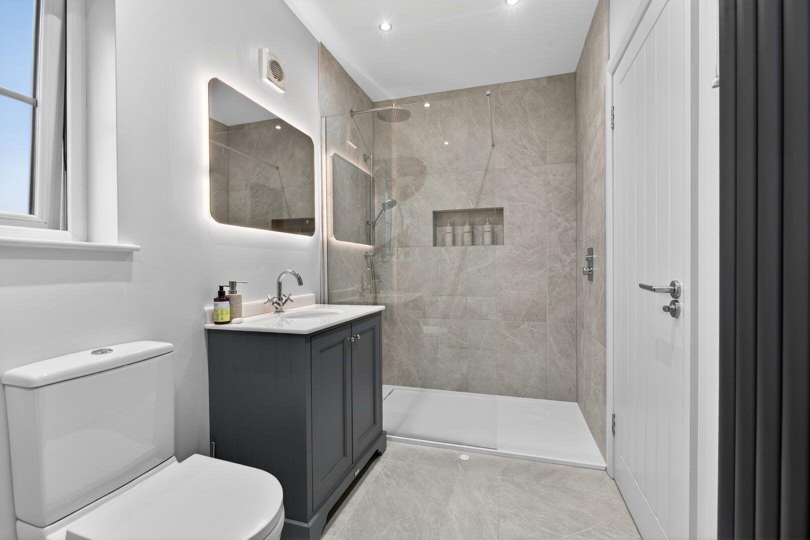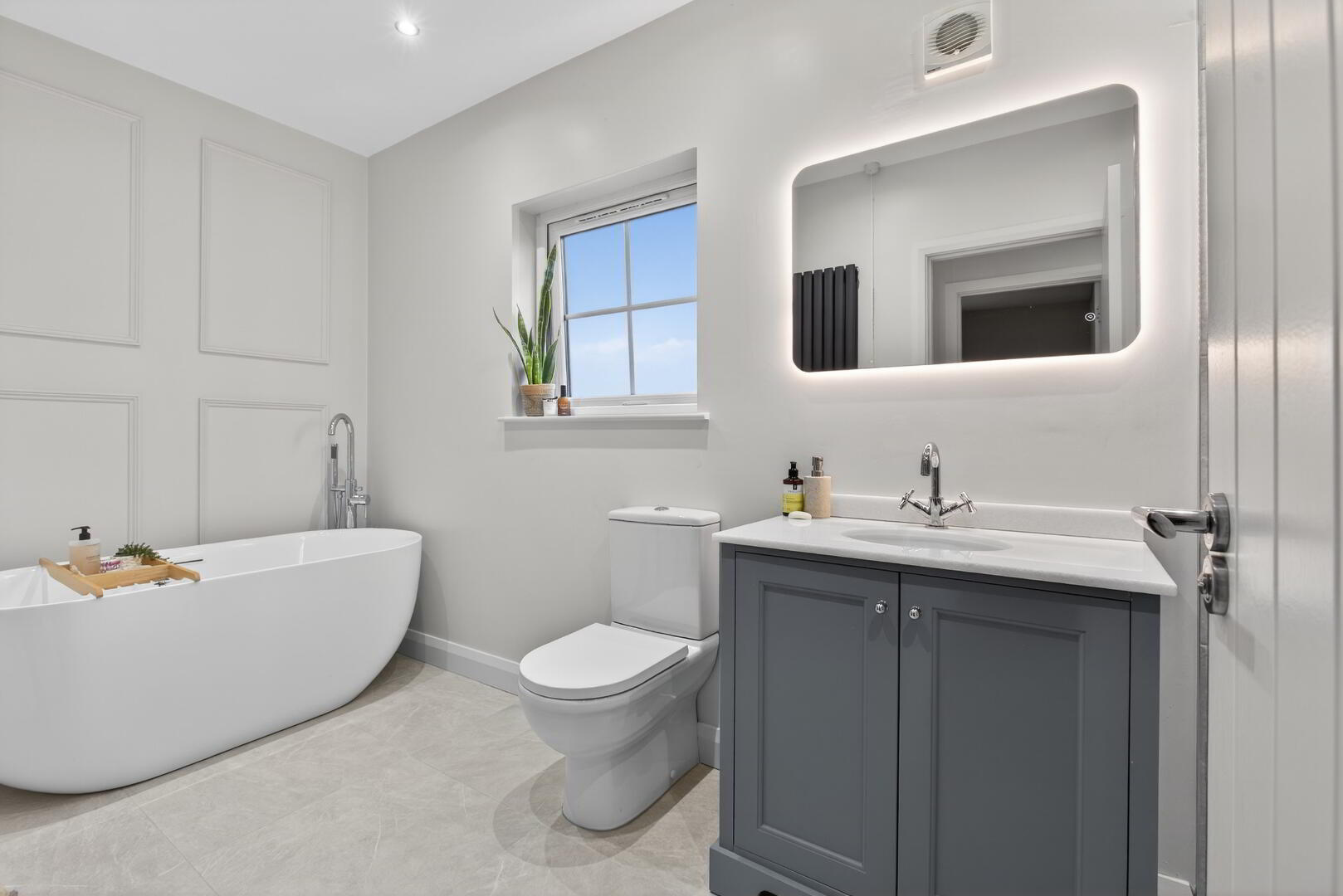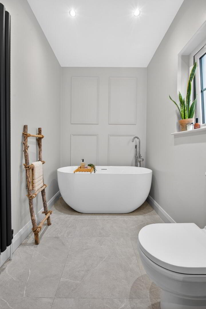 Comprising step in fully tiled shower cubicle with shower unit off mains, drench head and separate hand shower set, vanity unit with quartz work top and inset basin and mixer tap, wall mounted mirror with lighting, back to wall low flush wc, freestanding bath, floored mounted mixer tap and separate hand shower set, feature panelling, vertical slatted radiator, tiled flooring, recessed spotlights