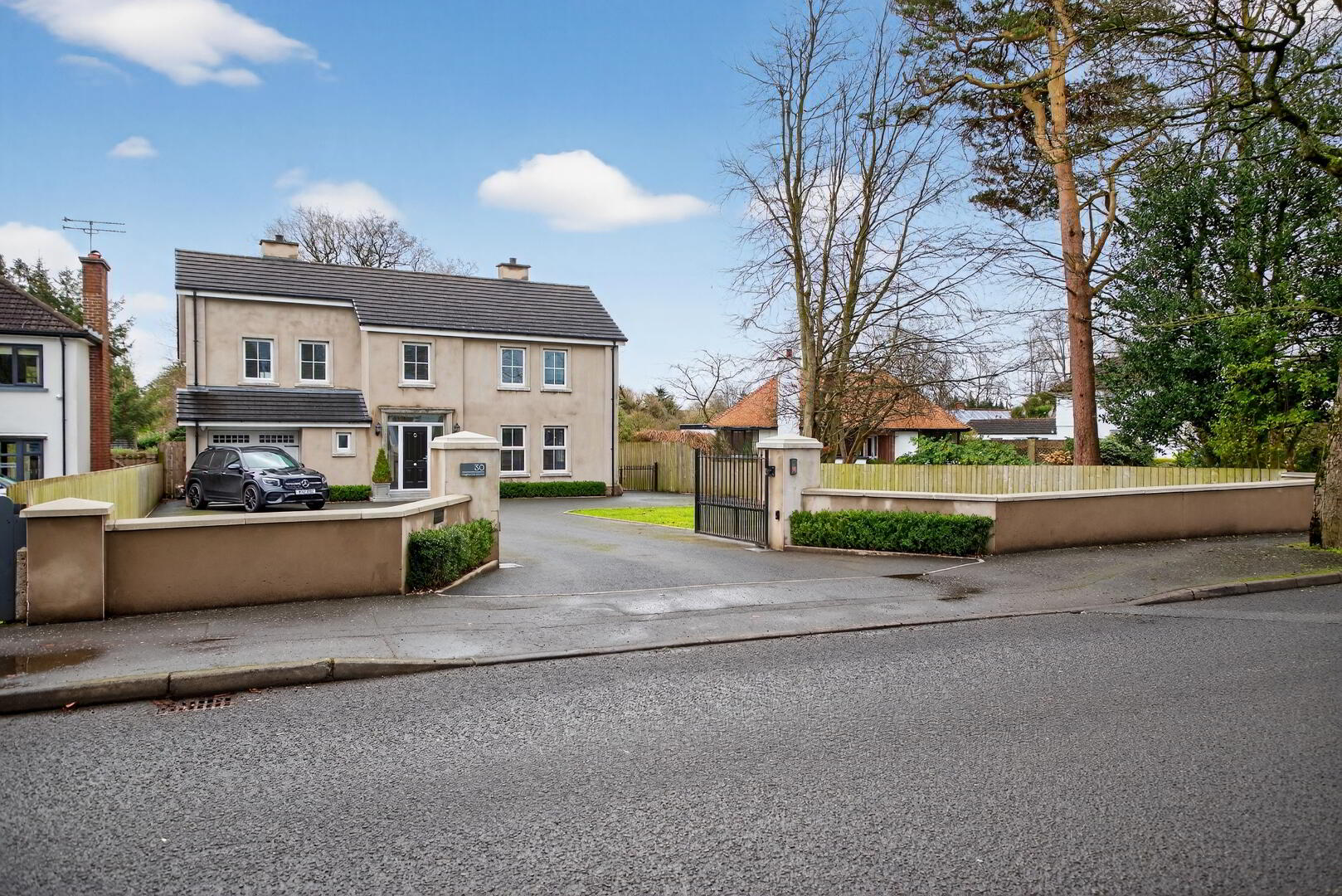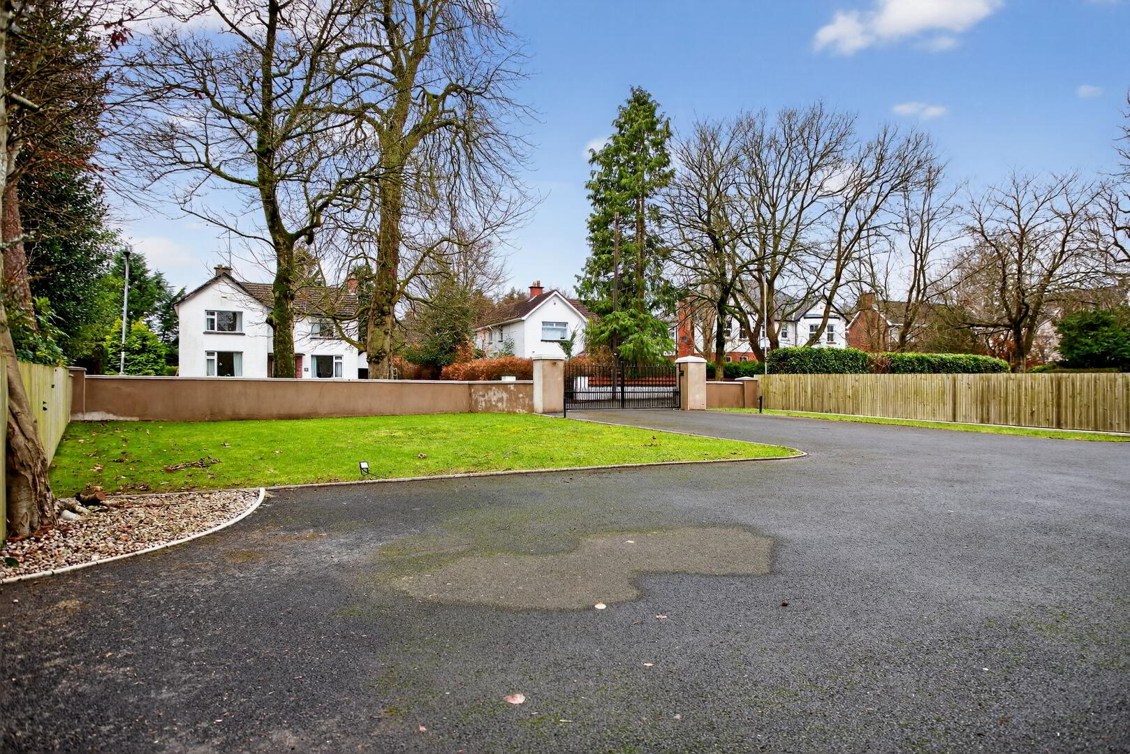 Walled and pillared entrance with electric gates leading to tarmac driveway flanked by lawned areas to either side providing ample parking, ground mounted lighting (on timer) and leading to integral garage;