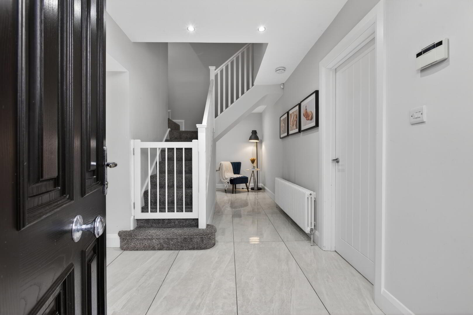 With tiled flooring extending through and including cloaks cupboard with lighting, understairs storage cupboard