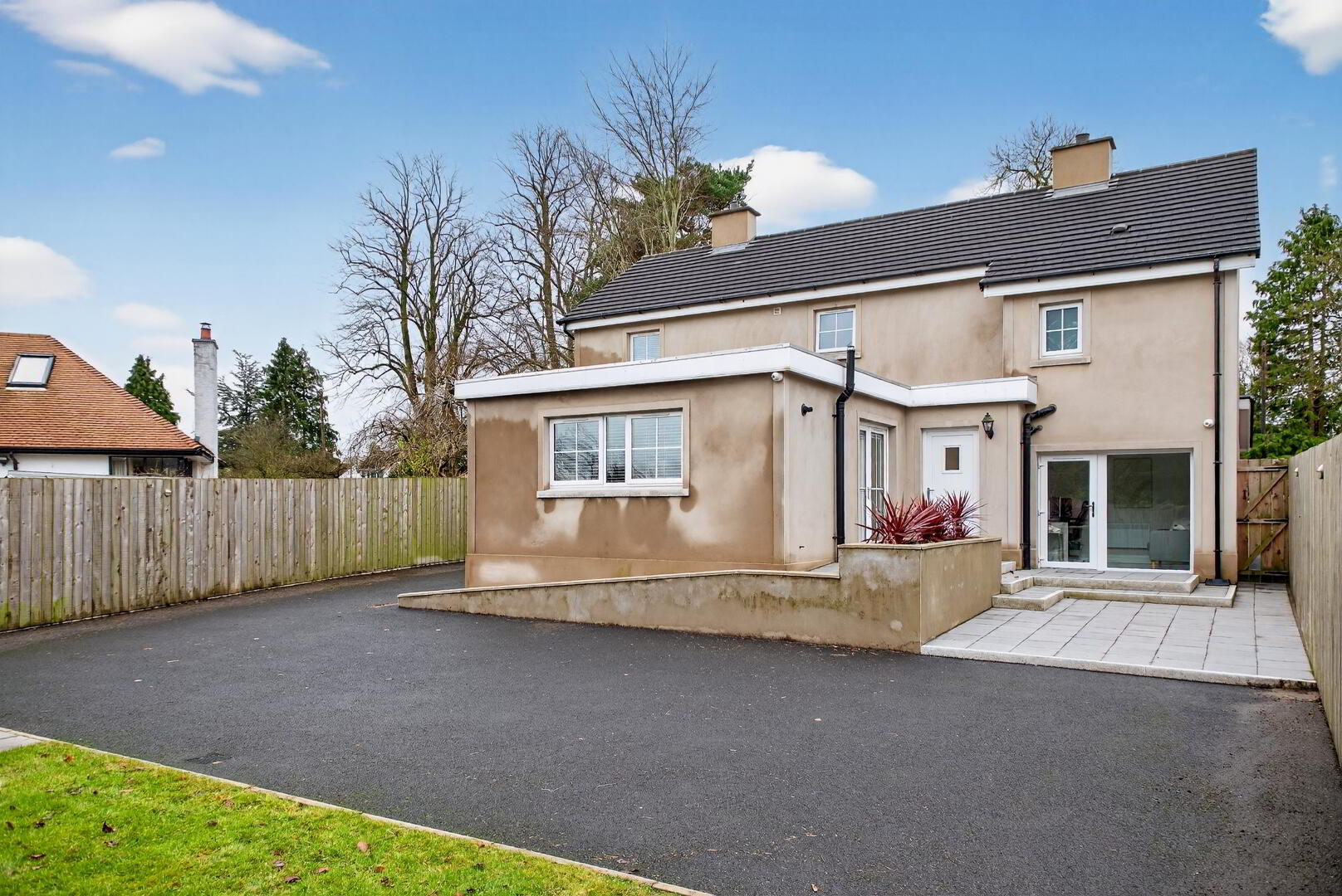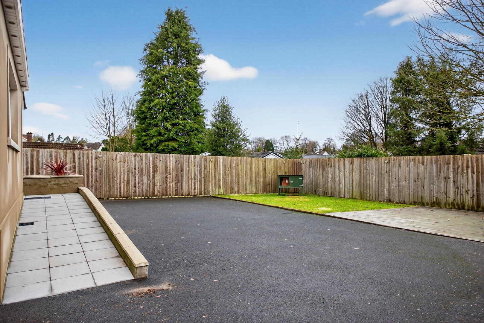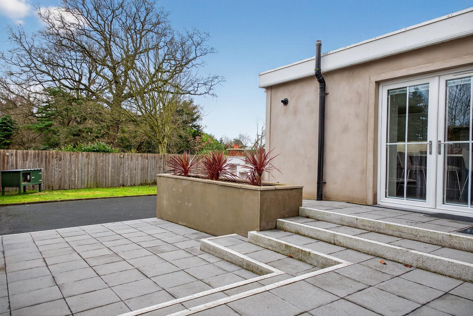 Enclosed rear garden with lawned area, paved steps leading to paved patio area