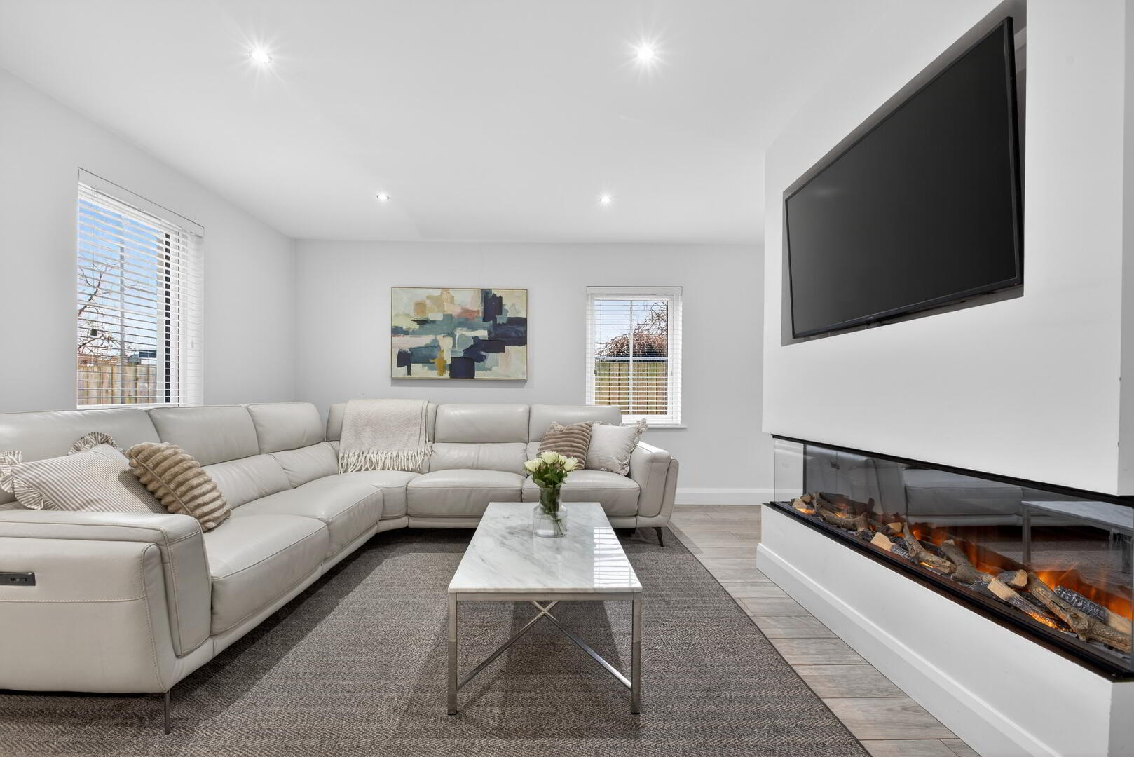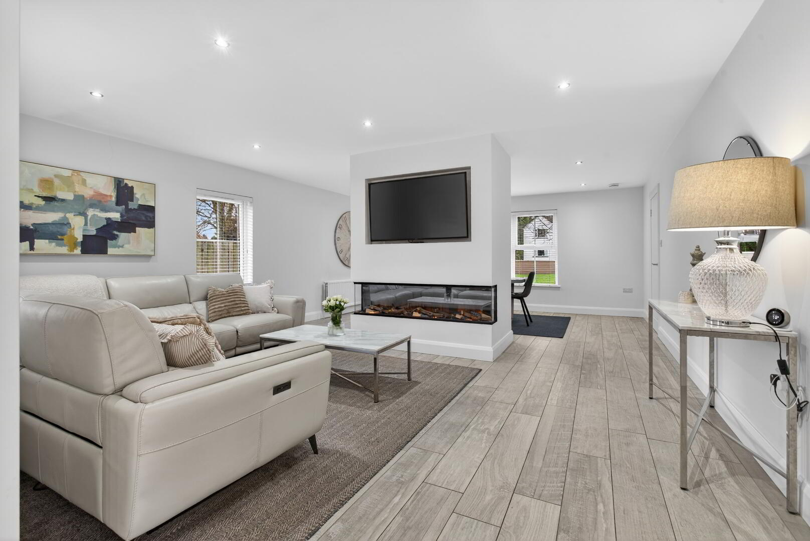 Centred media wall with Evonic e1800 wrap around log burning effect electric fire, recess for 55” TV, data point, recessed spotlights, low level TV point, open to;