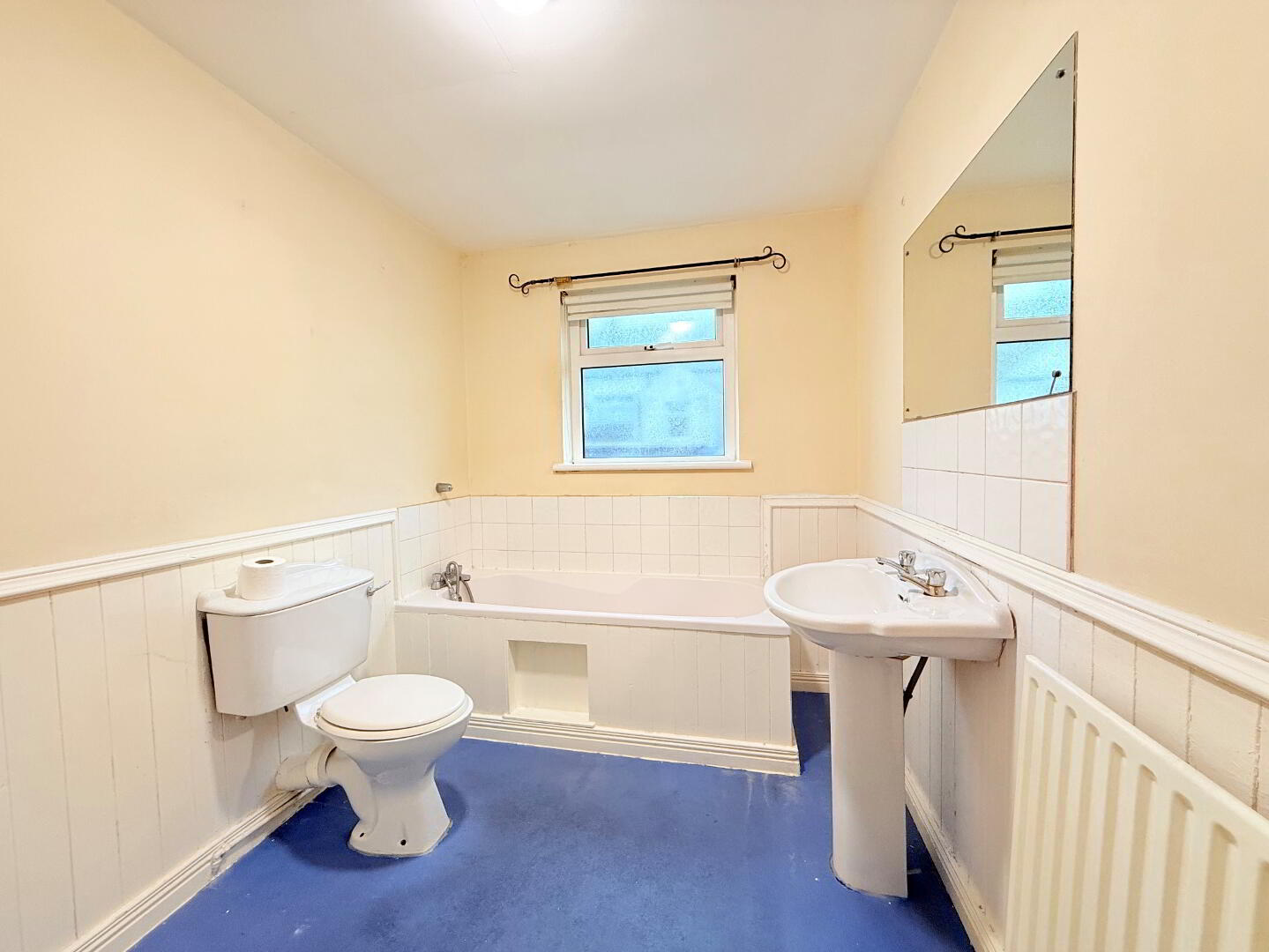 Bath with mixer shower tap, low flush wc, pedestal wash hand basin, uPVC double glazed window to rear, radiator, built in hot press, part tiled walls and part wood panelled walls