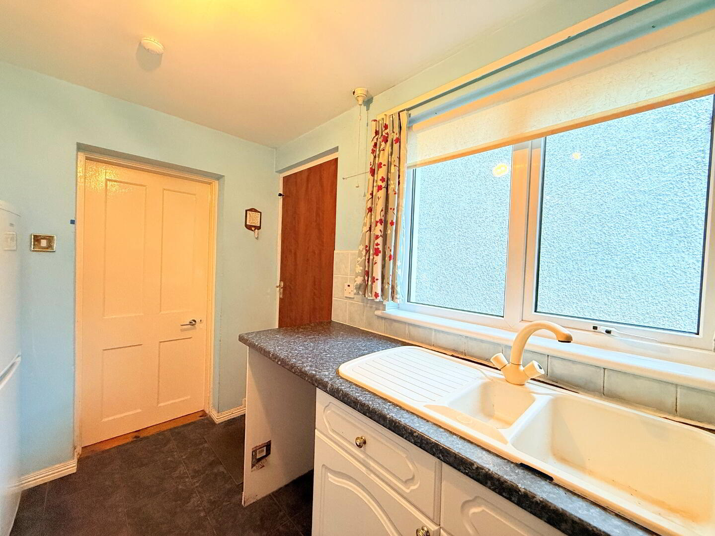 Range of eye and low level units, electric oven, hob, pull out extractor hood, space for fridge freezer, plumbed for washing machine, 1 1/4 sink with mixer tap, tiled flooring, part tiled walls, uPVC double glazed window to side, door to side