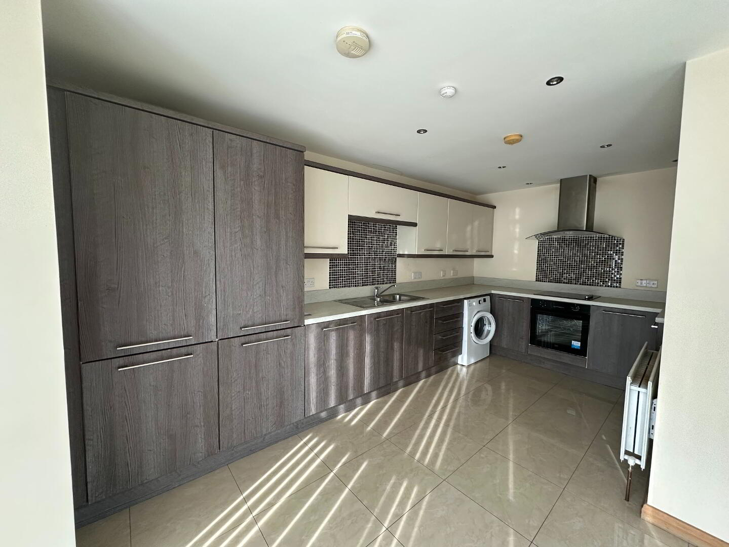 Modern kitchen with grey grained effect finish and off white doors, 4 ring electric hob with curved glass canopy and extractor hood, mosaic tiled splashback, low level fan assisted oven and grill, freestanding Hotpoint washing machine, integrated fridge freezer and dishwasher, stainless steel 1 1/2 sink unit and mixer tap, mosaic tiled splashback, grey worktops and upstands, under unit lighting, integrated spotlights, tiled flooring