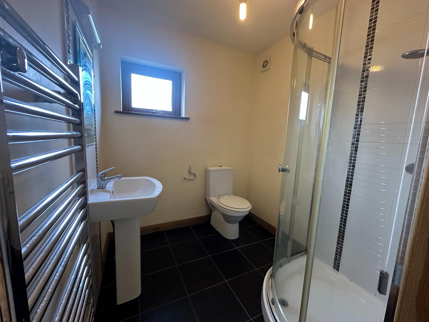 Comprising fully tiled shower cubicle with shower unit off mains, pedestal wash hand basin with mixer tap, full height tiled splashback panel, fitted mirror, light and shaver point, low flush wc, vertical heated towel rail, tiled flooring