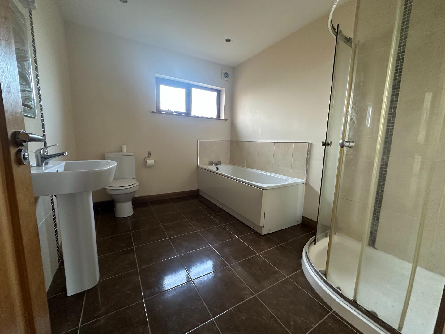 Comprising fully tiled shower cubicle with shower unit off mains, panelled bath with mixer tap and splashback tiling, pedestal wash hand basin with mixer tap and full height tiled splashback panel, fitted mirror, light and shaver point, low flush wc, vertical heated towel rail, tiled flooring, integrated spotlights