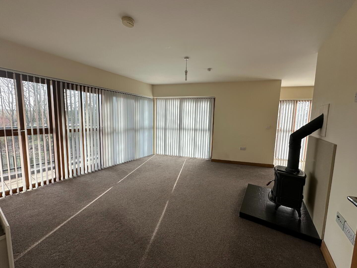 With freestanding log burner and tiled hearth, raised TV point, separate low level TV and satellite points, double doors opening to covered veranda with balustrading and lighting