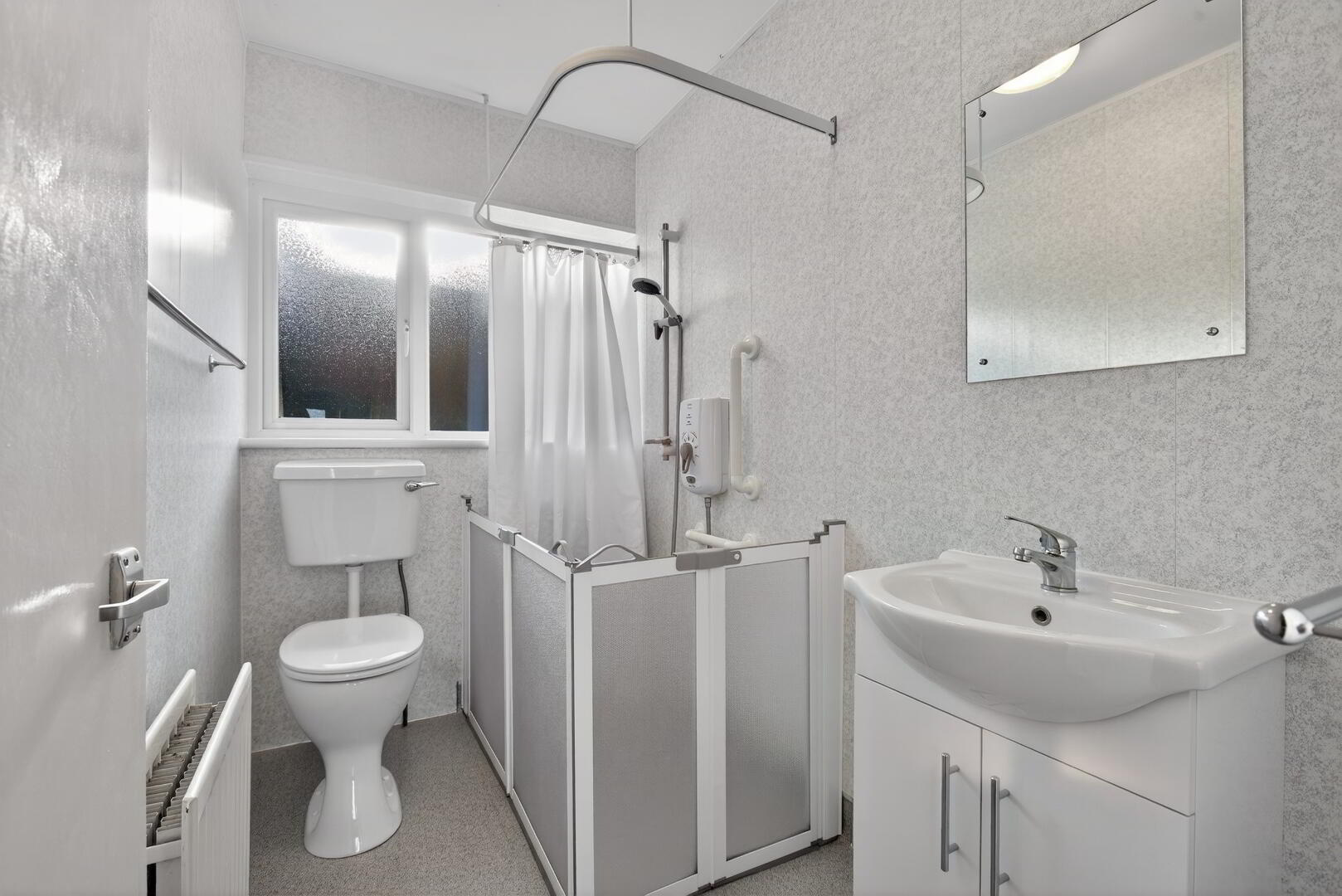 Comprising of low flush wc, wash hand basin with mixer tap set on vanity unit, disabled shower enclosure with Triton electric shower, waterproof vinyl flooring, panelling to walls, radiator, uPVC double glazed window to rear