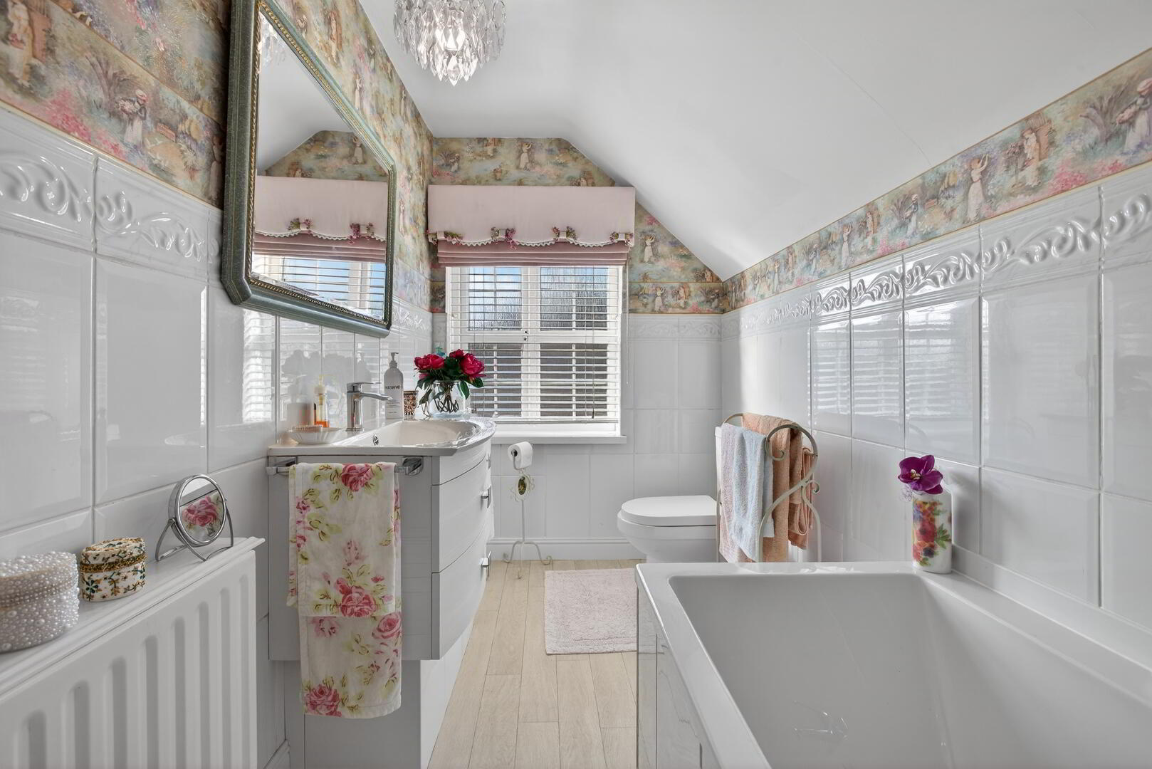 Bathe with centre mixer tap, wash hand basin with mixer tap set on vanity unit, low flush wc, part tiled walls, uPVC double glazed window to side, radiator
