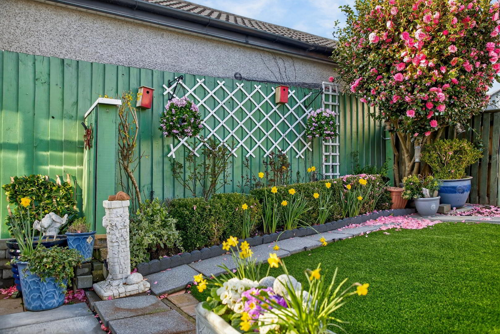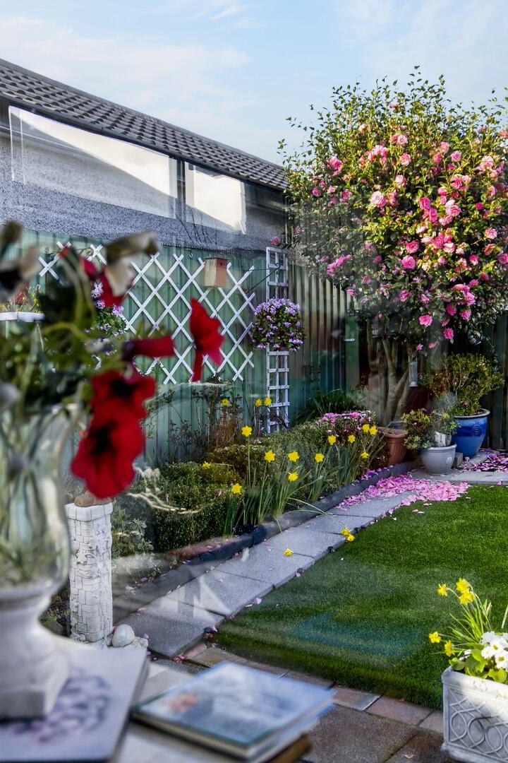 Steps leading to front entrance and garden with artificial grass and paved walkway